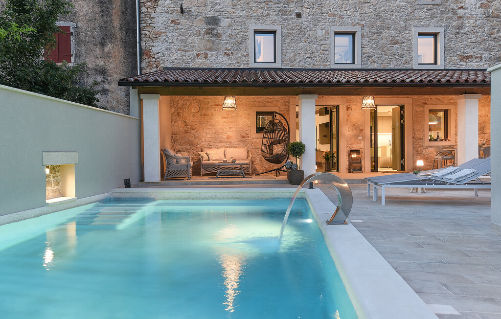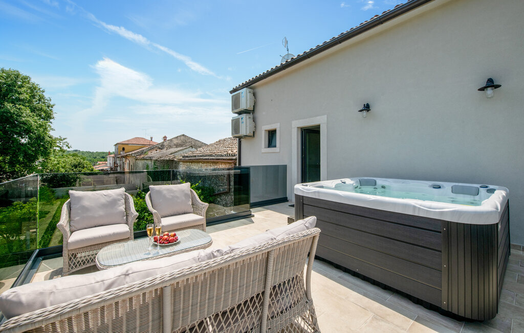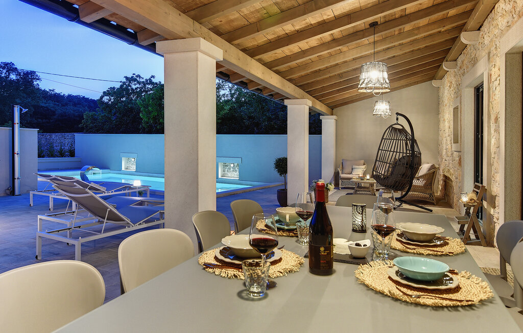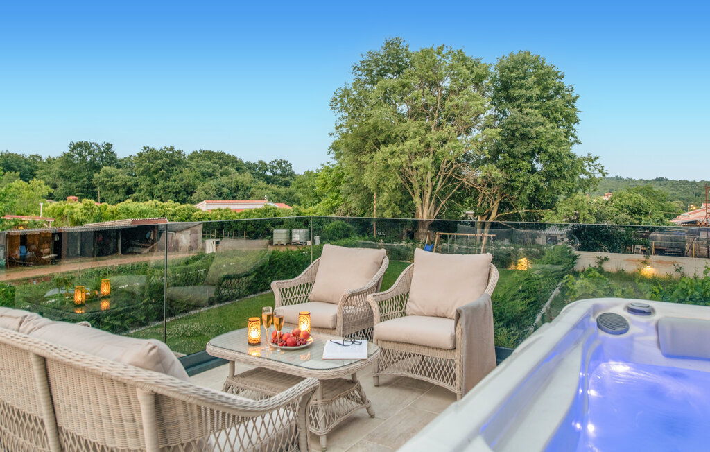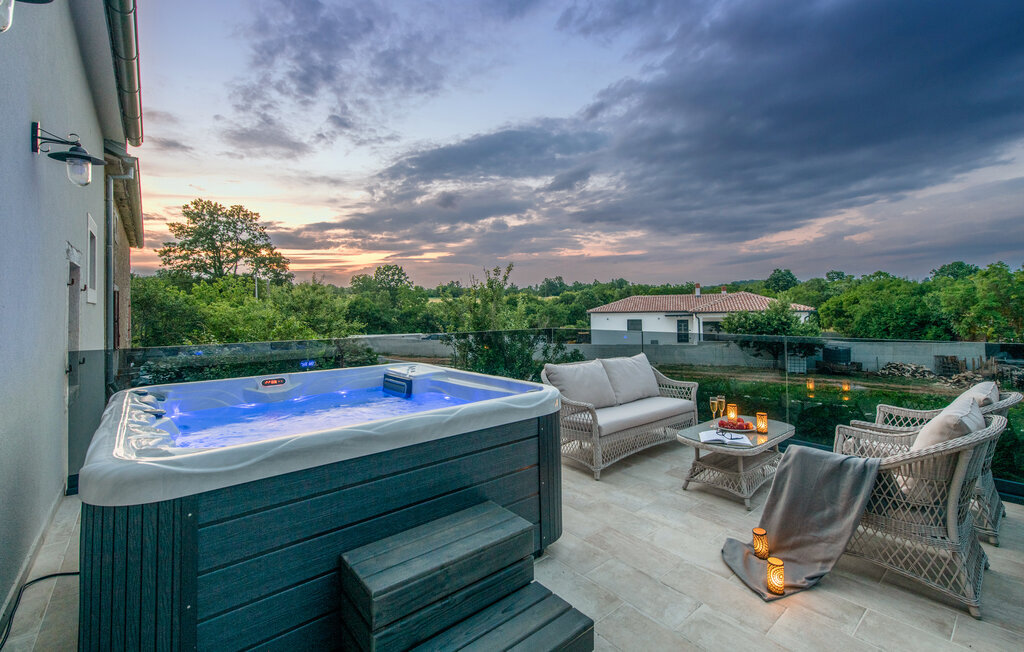 Bien-être à l'extérieur : Location de vacances disposant de chaises-longues et d'un ou plusieurs équipements tels que piscine extérieure, jacuzzi extérieur, lit à baldaquin de jardin etc...