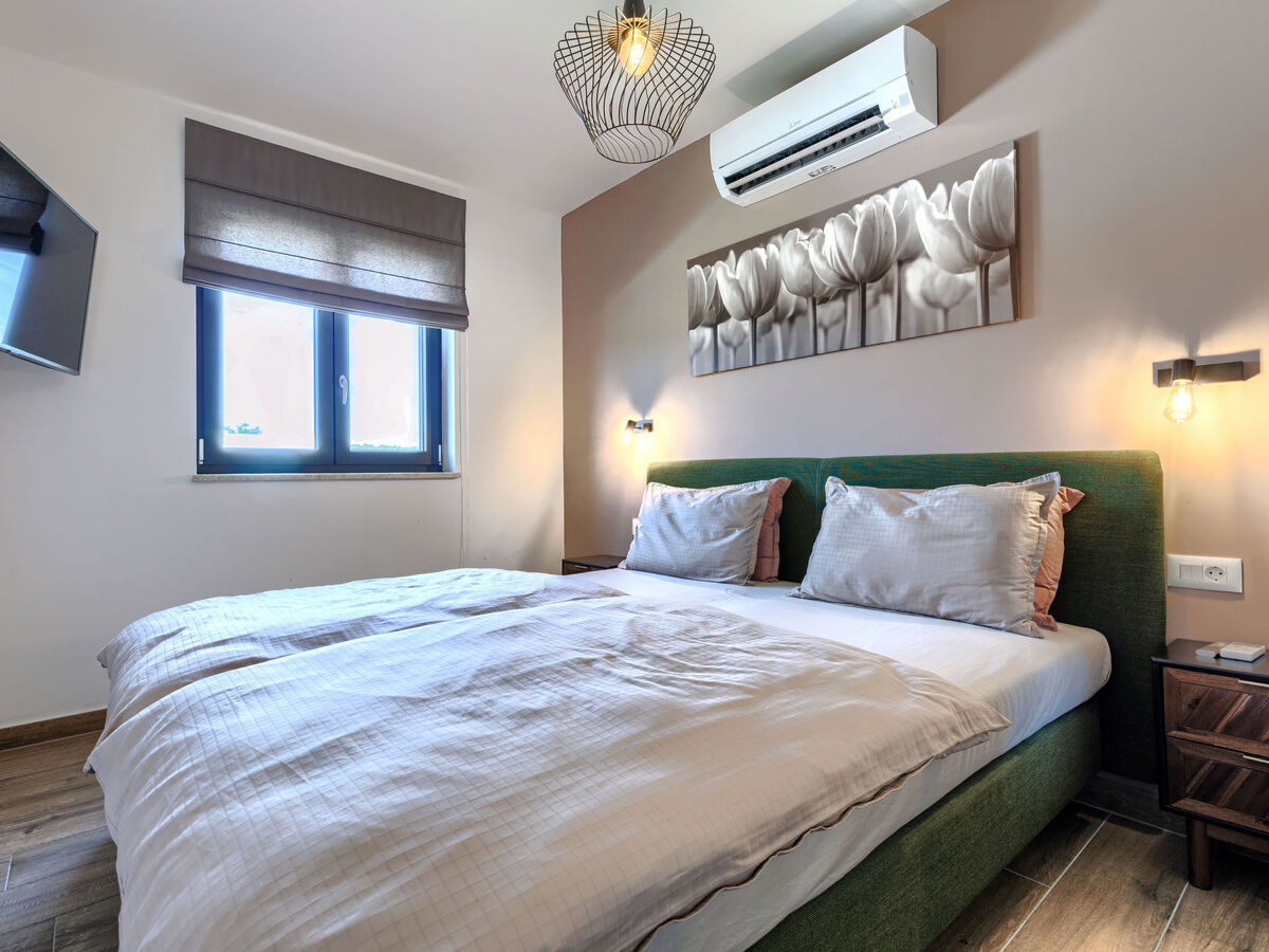 1 chambre avec 1 grand-lit (160 cm, longueur 200 cm), TV (satellite) et air-conditionné.