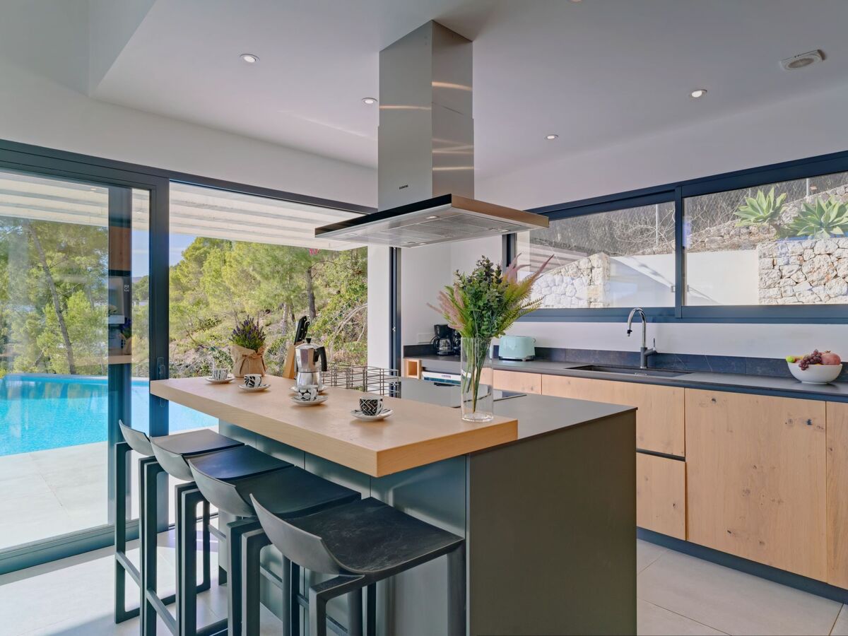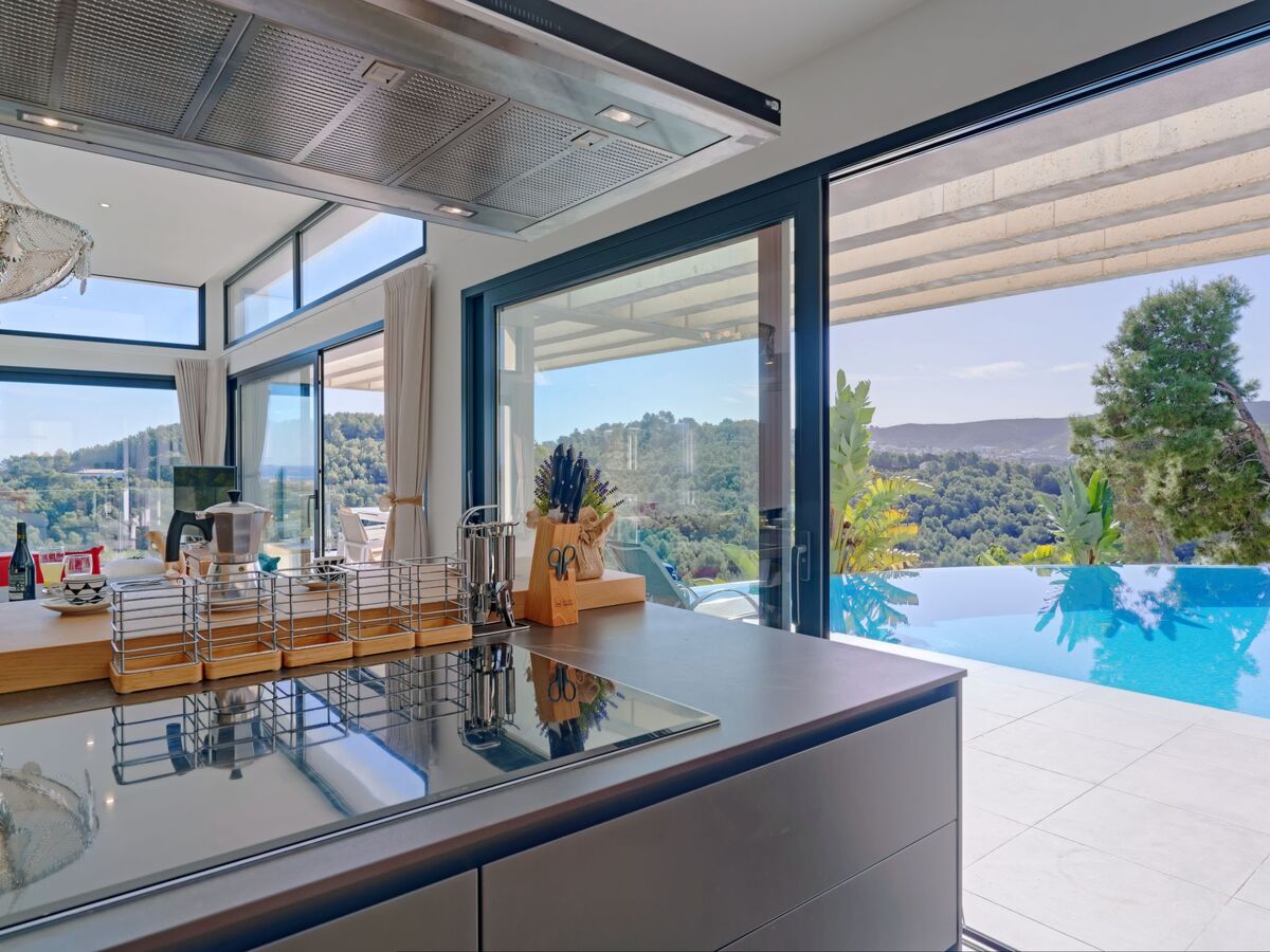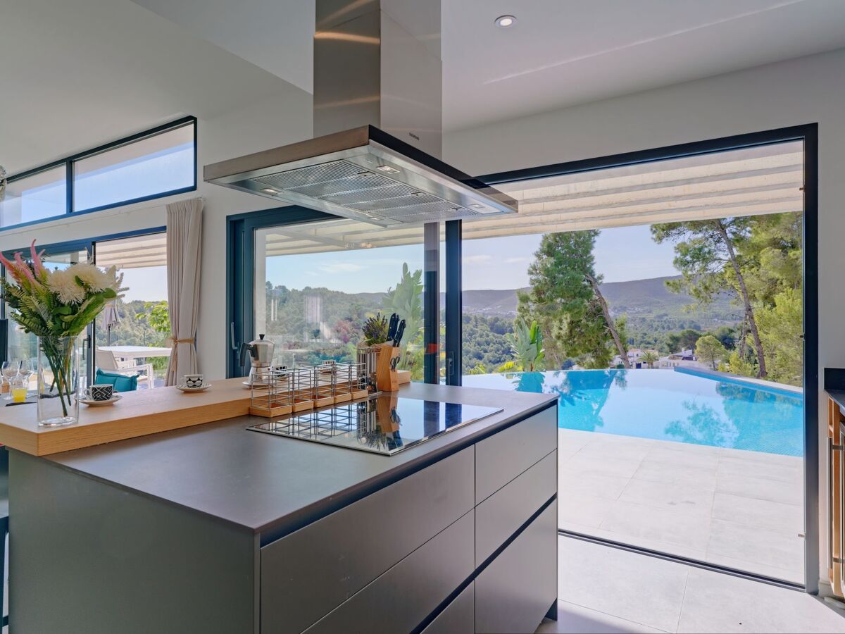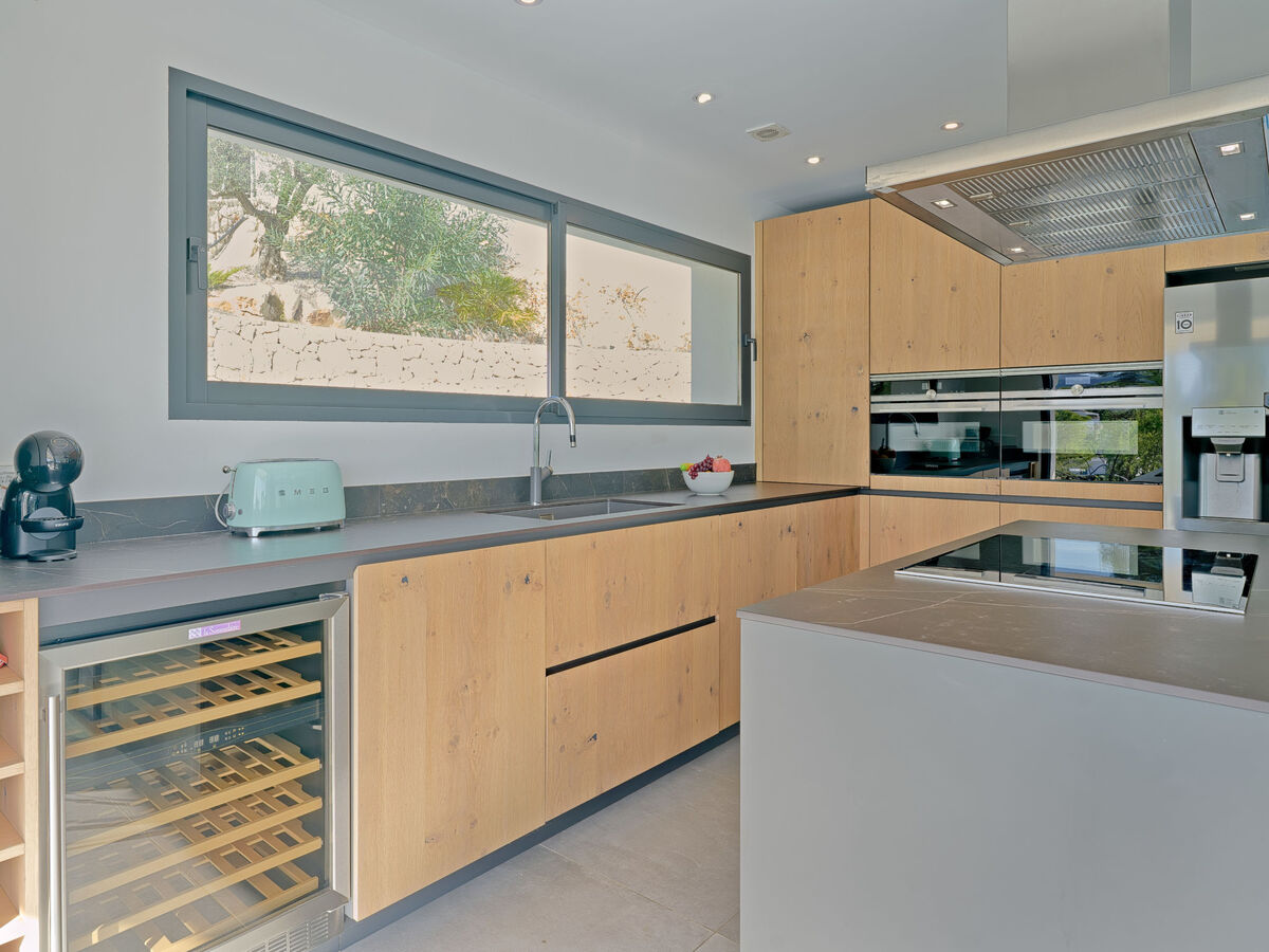 Cuisine ouverte (four, lave-vaisselle, 4 plaques à induction, grille-pain, micro-ondes, congélateur, cafetière électrique, ilot de cuisine) avec air-conditionné et chauffage à air chaud.