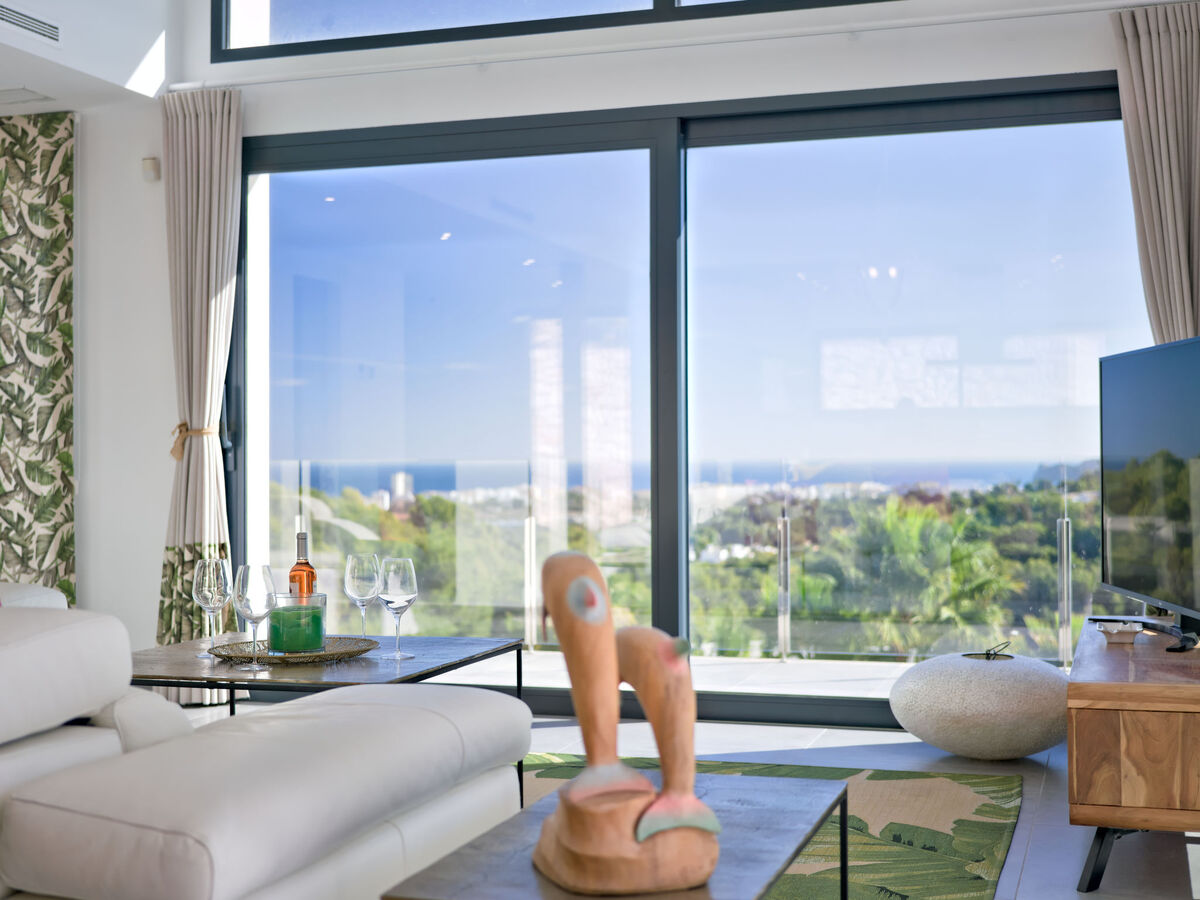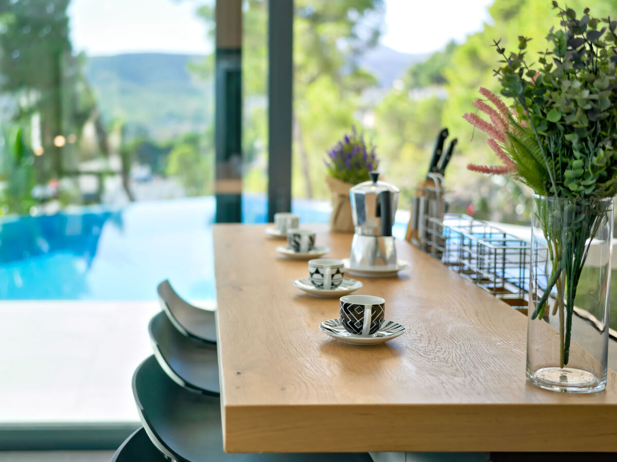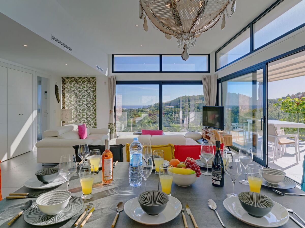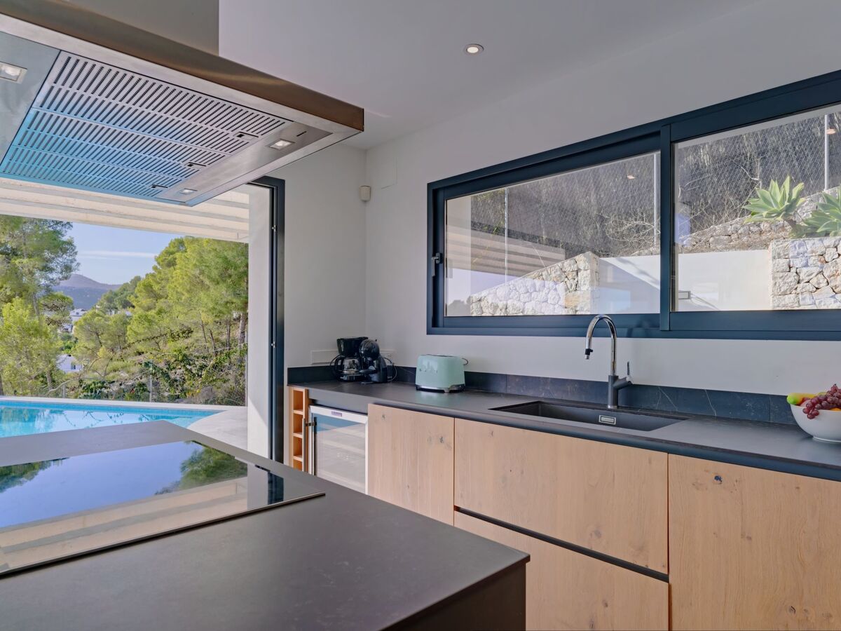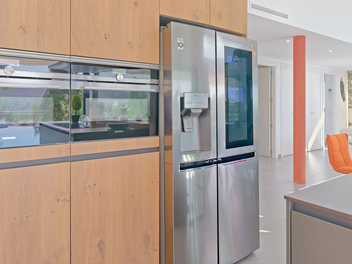 Cuisine ouverte (four, lave-vaisselle, 4 plaques à induction, grille-pain, micro-ondes, congélateur, cafetière électrique, ilot de cuisine) avec air-conditionné et chauffage à air chaud.