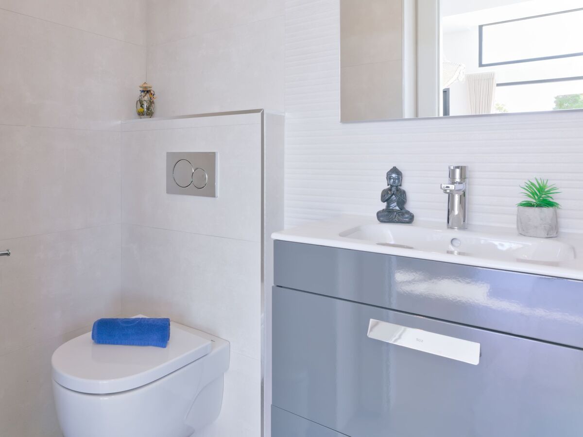 À l'étage inférieur: 1 chambre avec 1 grand-lit (160 cm, longueur 200 cm), douche/WC, air-conditionné et chauffage à air chaud.