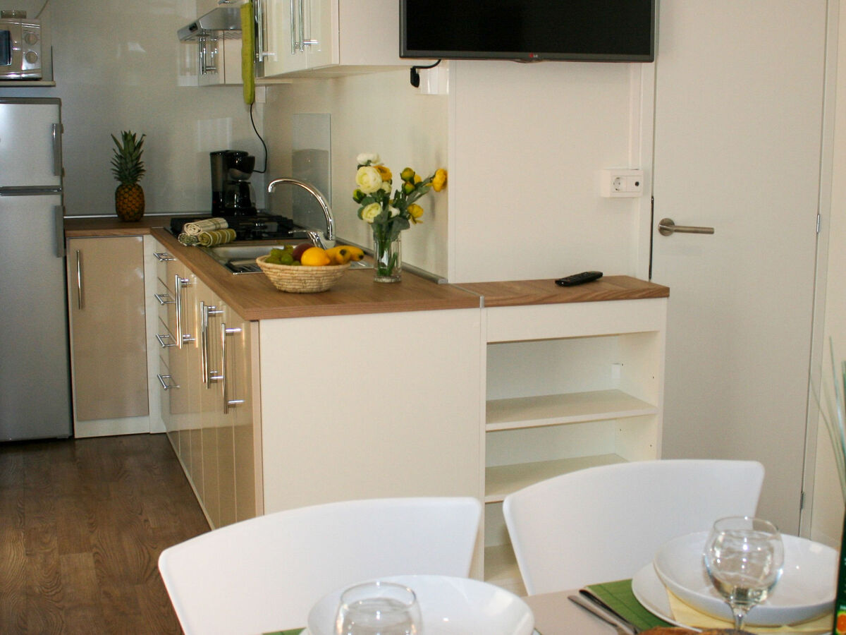 Cuisine ouverte (4 plaques vitrocéramiques, bouilloire électrique, micro-ondes, congélateur, cafetière électrique).