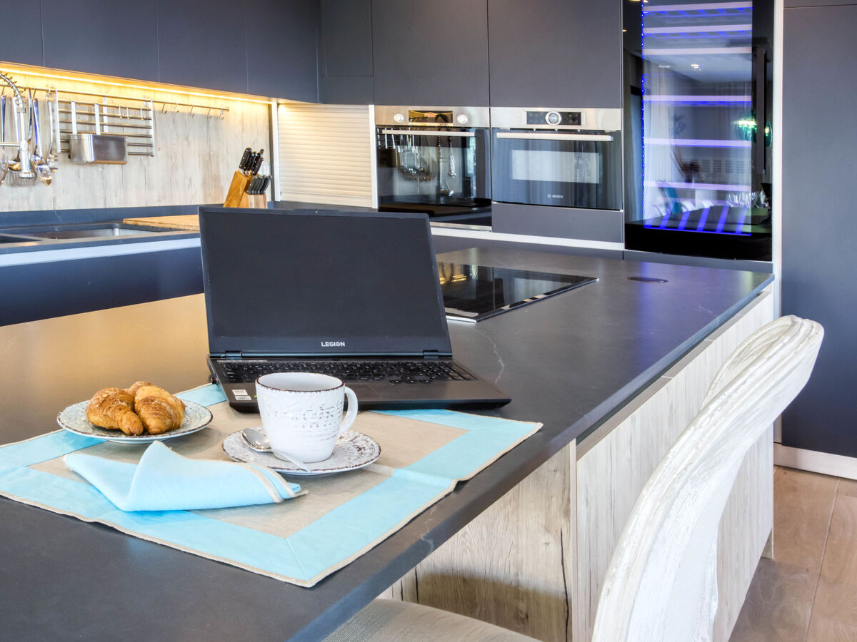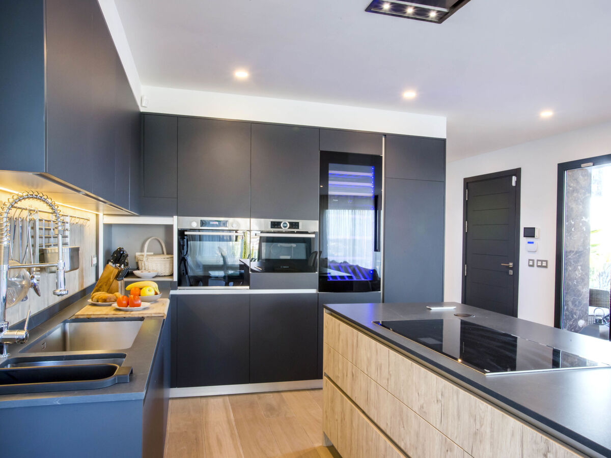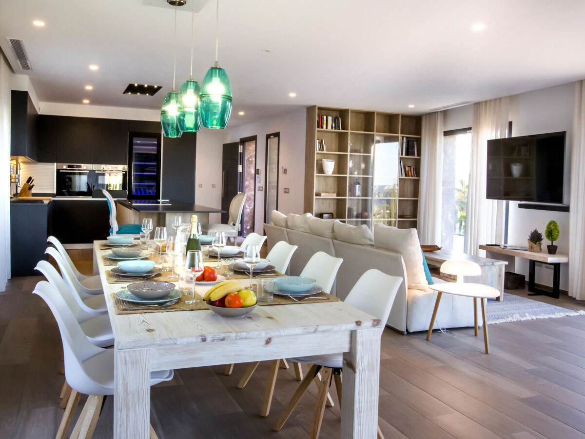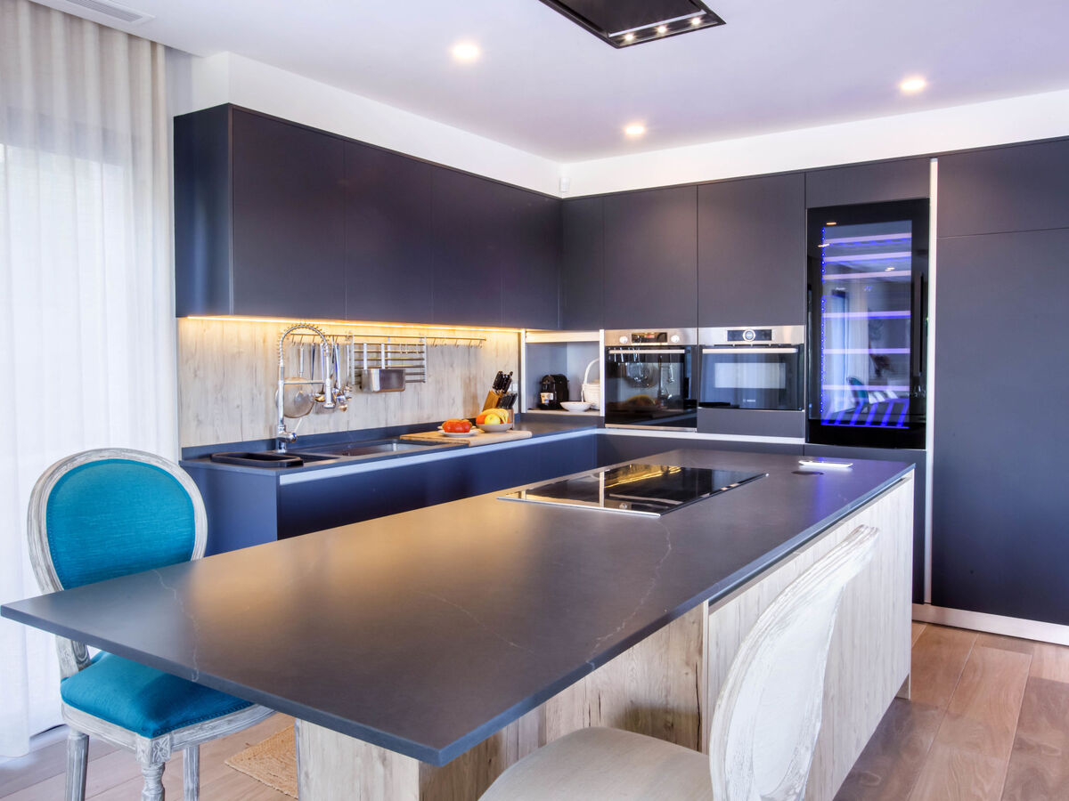 Grande cuisine ouverte (four, lave-vaisselle, 6 plaques à induction, grille-pain, bouilloire électrique, micro-ondes, congélateur, cafetière électrique, Capsules pour machine à café (Nespresso) (NON INCLUSES), ilot de cuisine) avec table pour les repas.