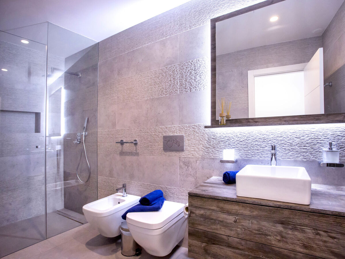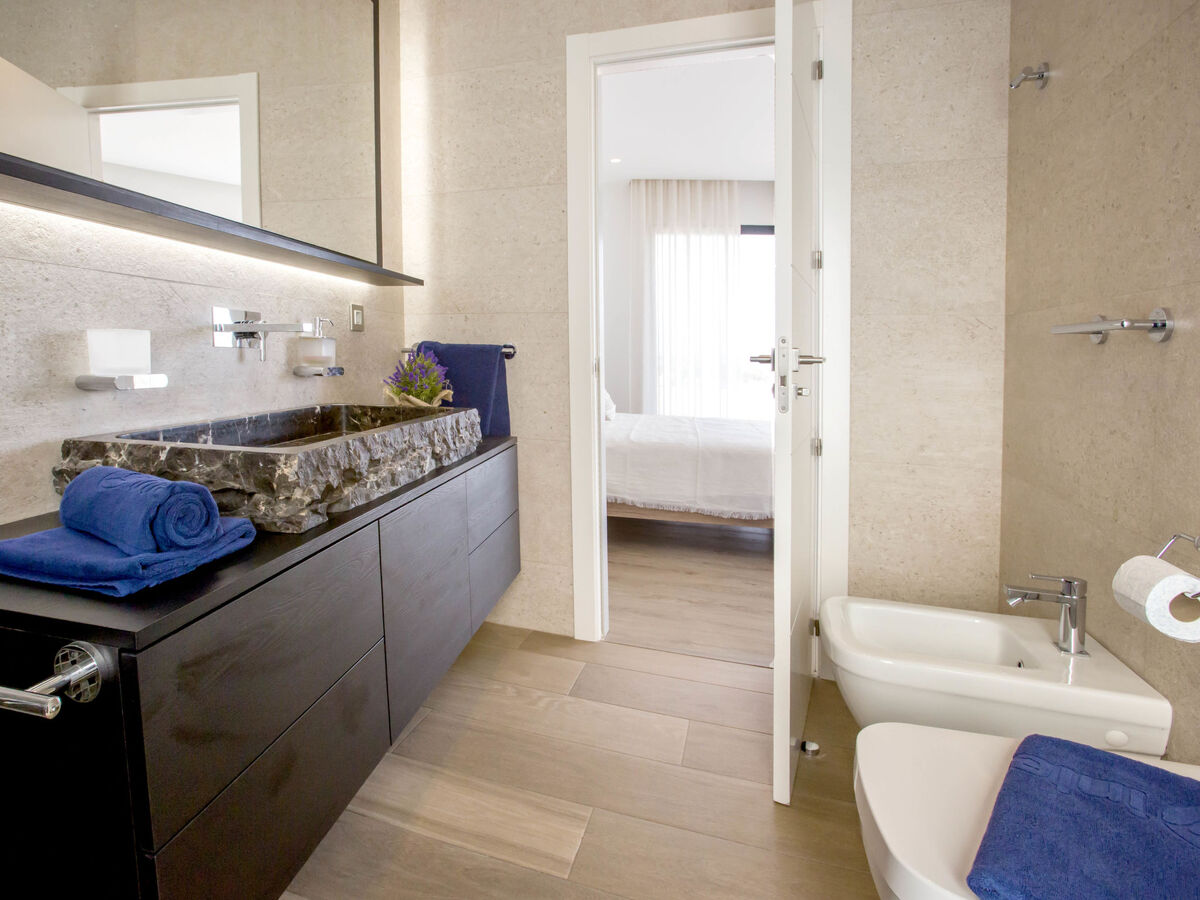 À l'étage inférieur: 1 chambre avec 1 grand-lit (160 cm, longueur 20 cm), douche/bidet/WC, air-conditionné et chauffage à air chaud.