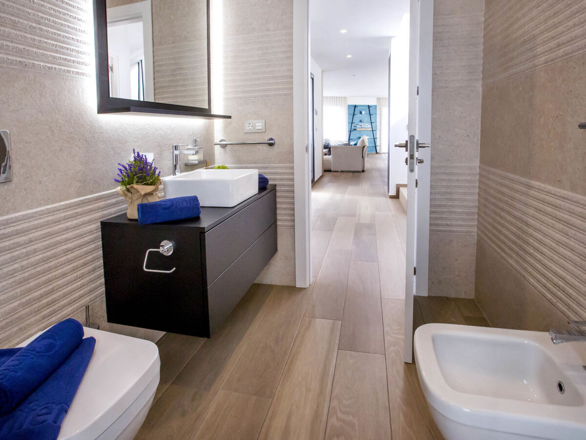 À l'étage supérieur: 1 chambre avec 1 grand-lit (160 cm, longueur 200 cm), douche/bidet/WC, air-conditionné et chauffage à air chaud.