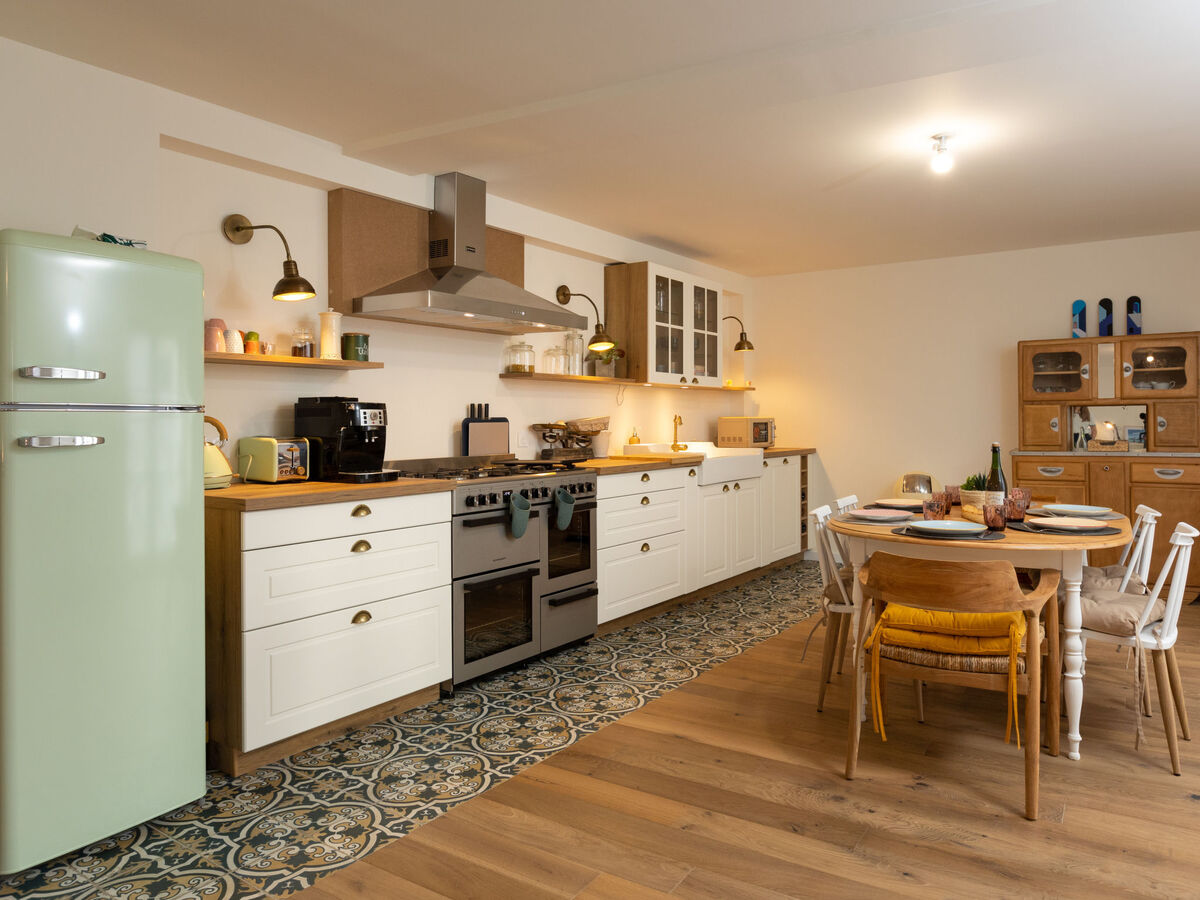 Cuisine ouverte (four, lave-vaisselle, 7 feux, grille-pain, bouilloire électrique, micro-ondes, cafetière électrique, Capsules pour machine à café (Delonghi) (NON INCLUSES)) avec table pour les repas.