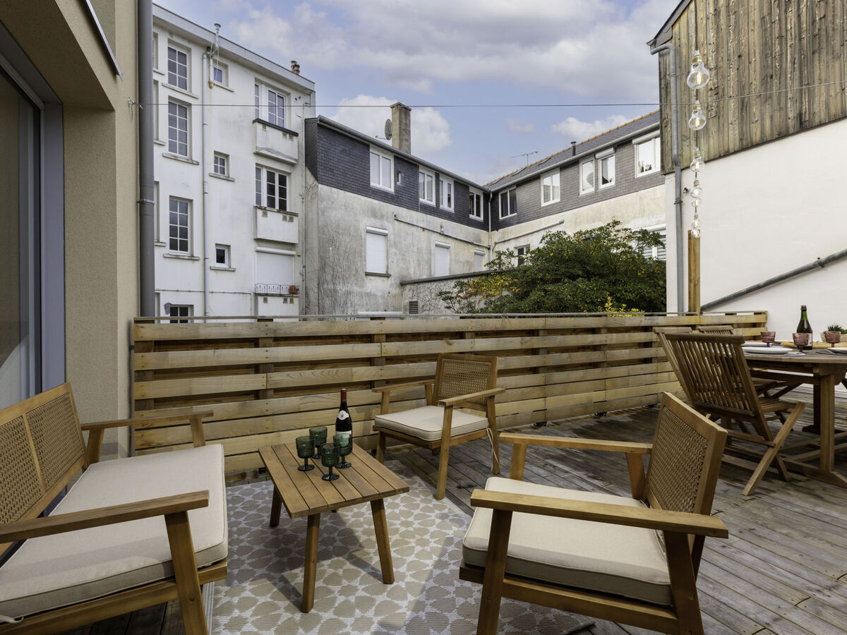 Location composée d'un bâtiment principal et d'une annexe, au centre de Dinard, dans la localité, à 10 m du centre de ville, situation centrale, au cœur de la ville, à, de la mer, à 400 m de la plage, dans une rue, orientée sud.