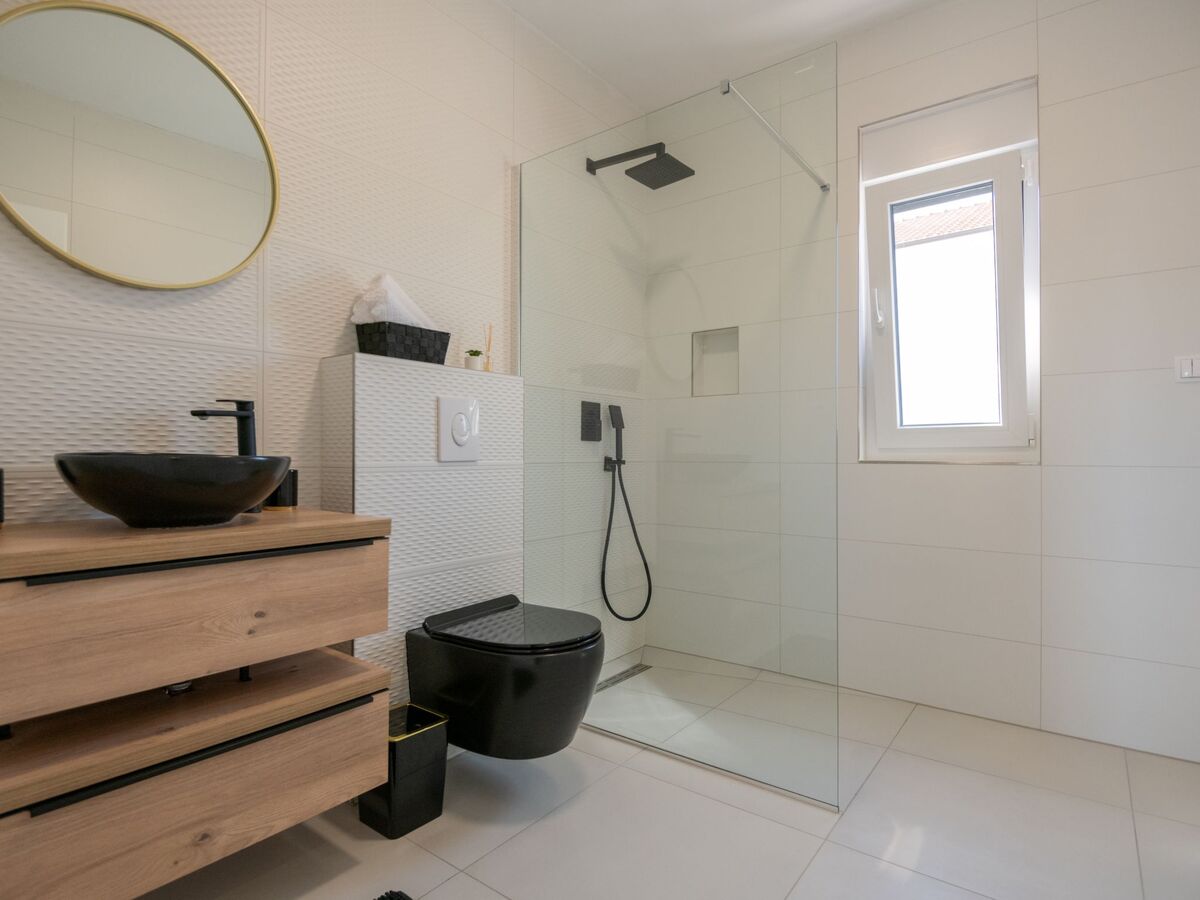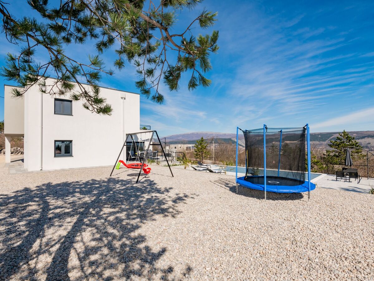 Douche extérieure, meubles de jardin, barbecue, espace de jeux pour les enfants (toboggan, balançoire).