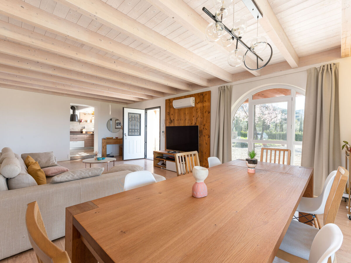 Spacieux et clair, aménagement de bon goût: grand séjour/salle à manger ouvert avec baie vitrée avec table pour les repas, écran plat et air-conditionné.