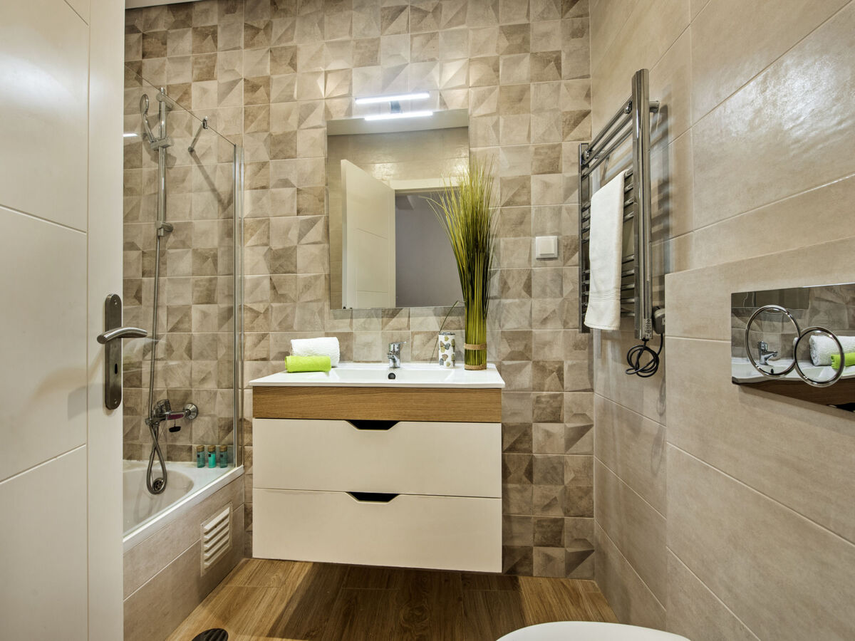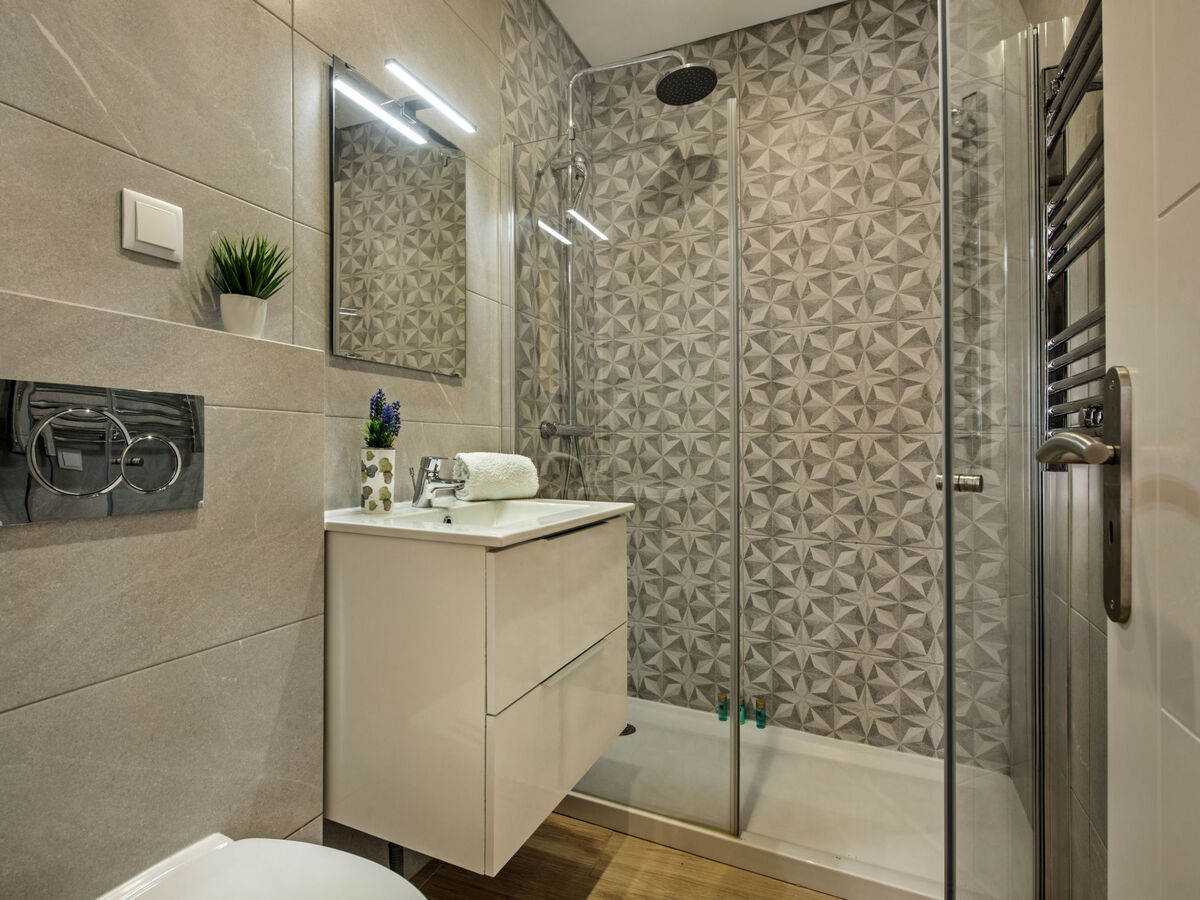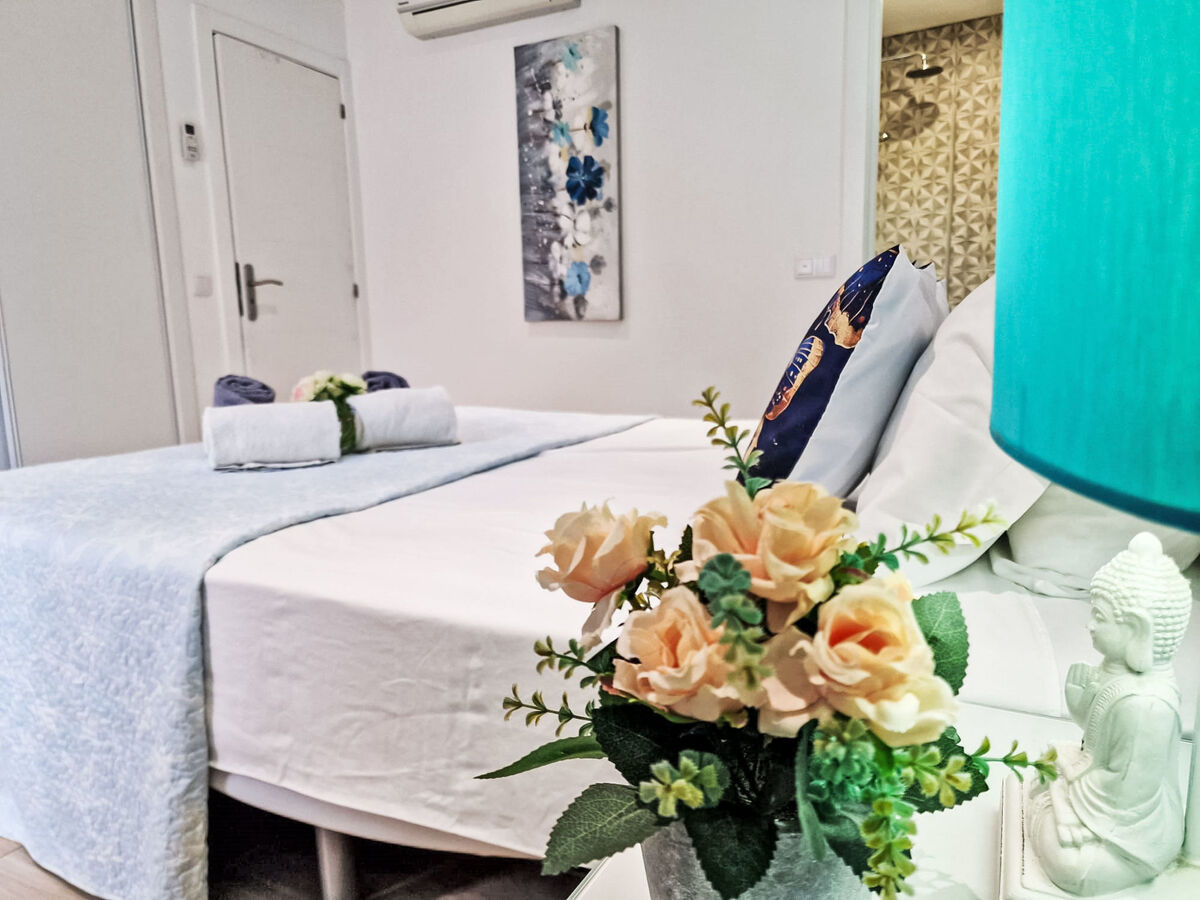 1 chambre avec 1 grand-lit (160 cm, longueur 200 cm), douche/WC, air-conditionné et chauffage à air chaud.