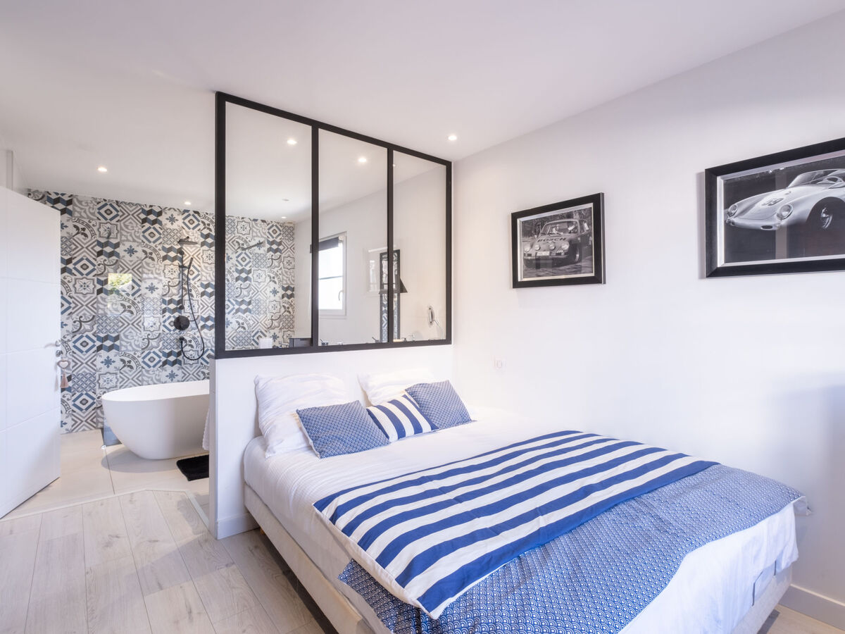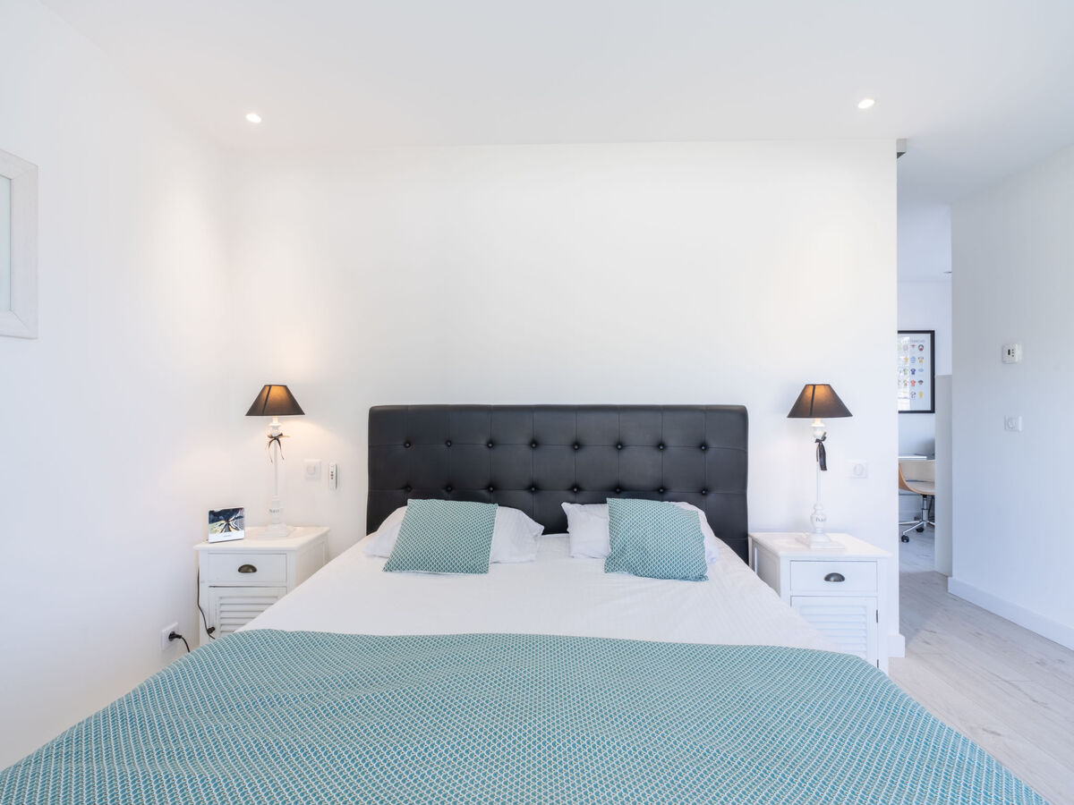 1 chambre avec 1 grand-lit (160 cm, longueur 200 cm), bain/douche et air-conditionné.