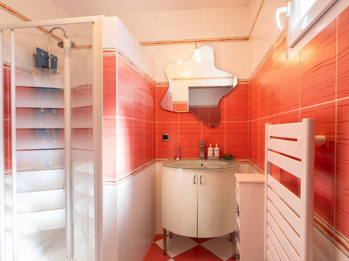 1 chambre avec 1 grand-lit (160 cm, longueur 200 cm), douche et air-conditionné.