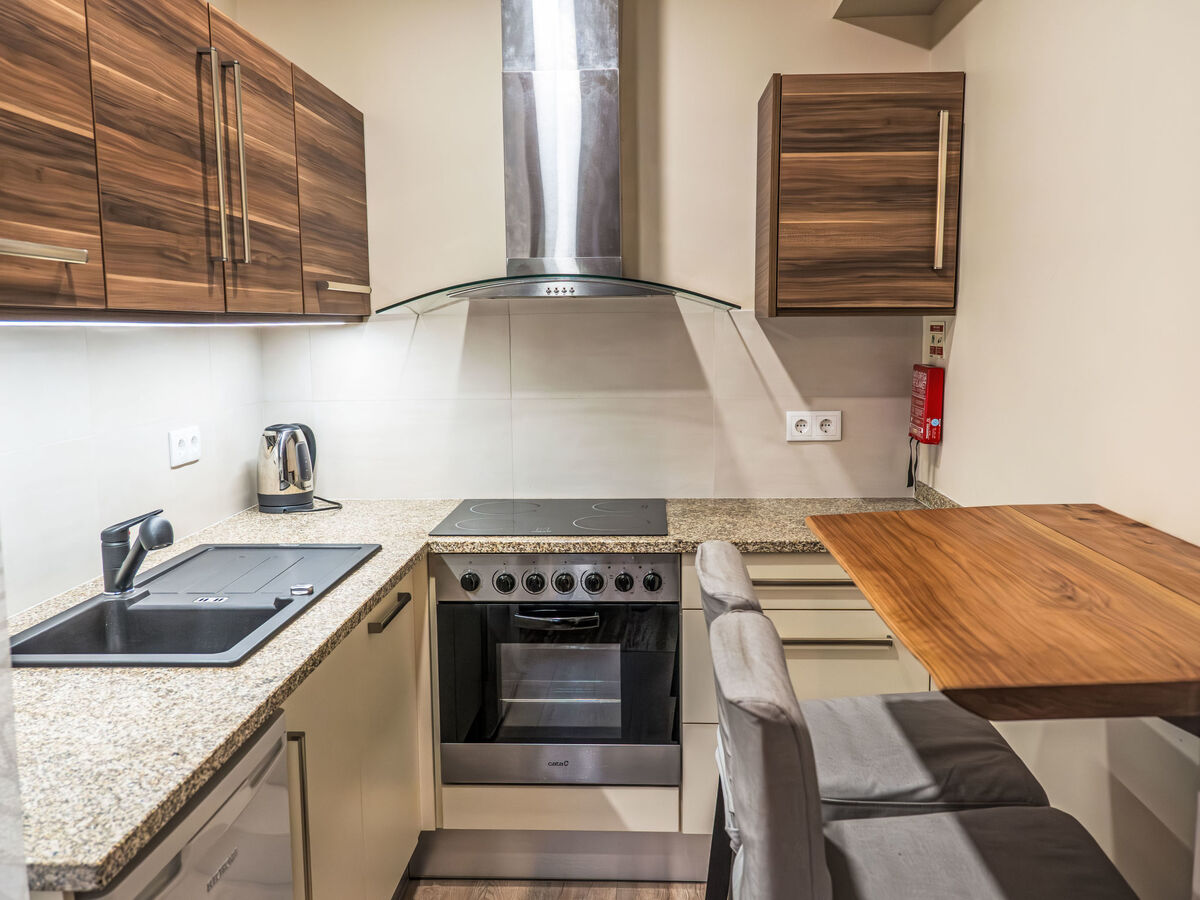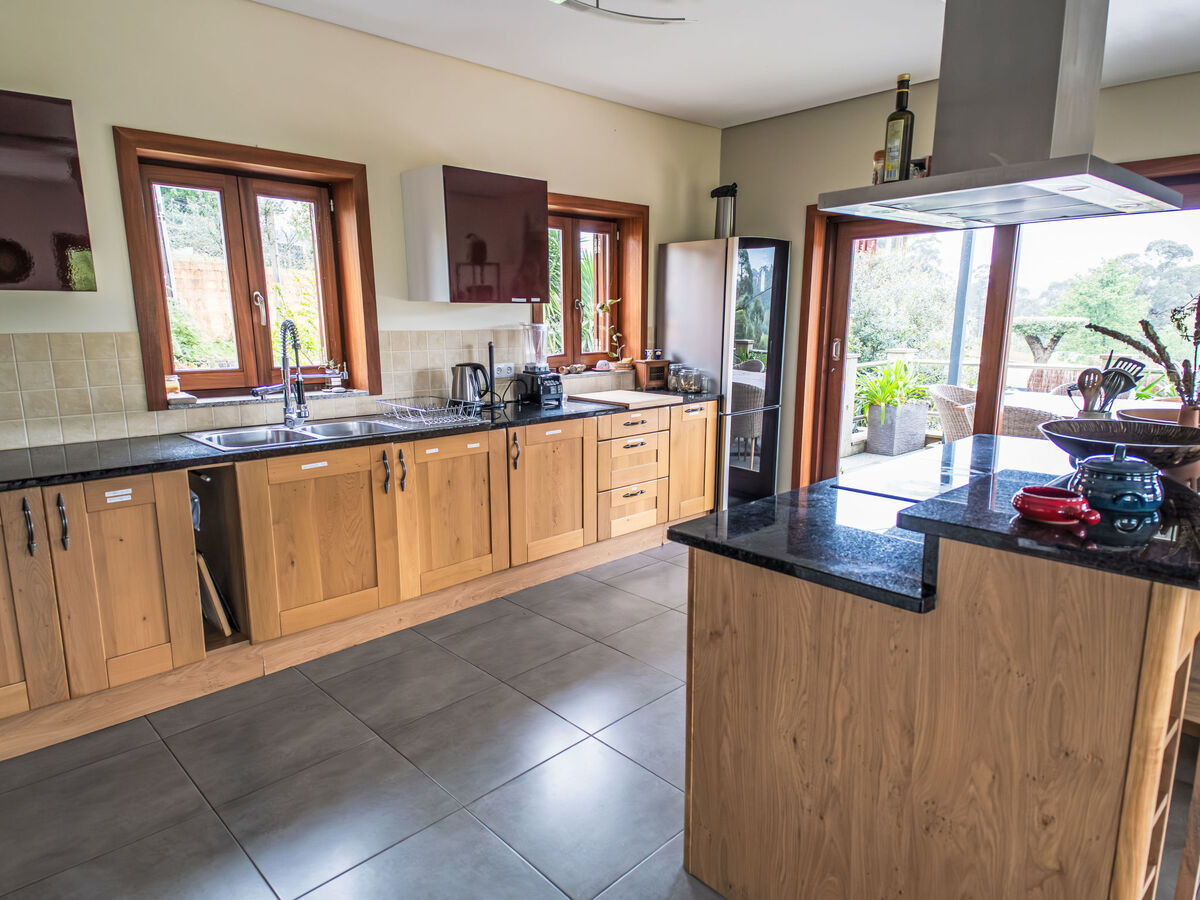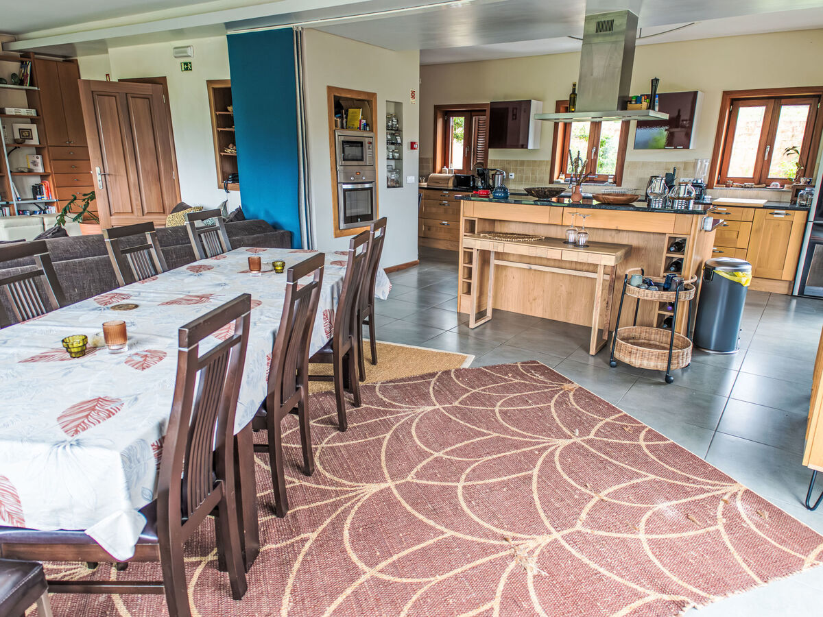 Cuisine ouverte (four, lave-vaisselle, 4 plaques à induction, grille-pain, bouilloire électrique, micro-ondes, congélateur, cafetière électrique, ilot de cuisine) avec table pour les repas.