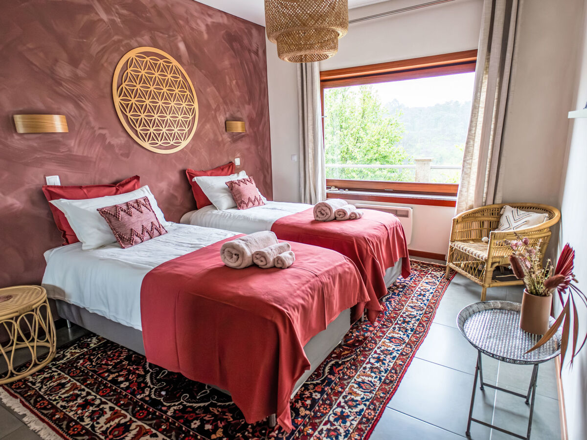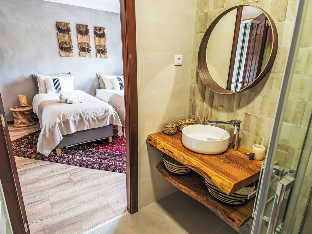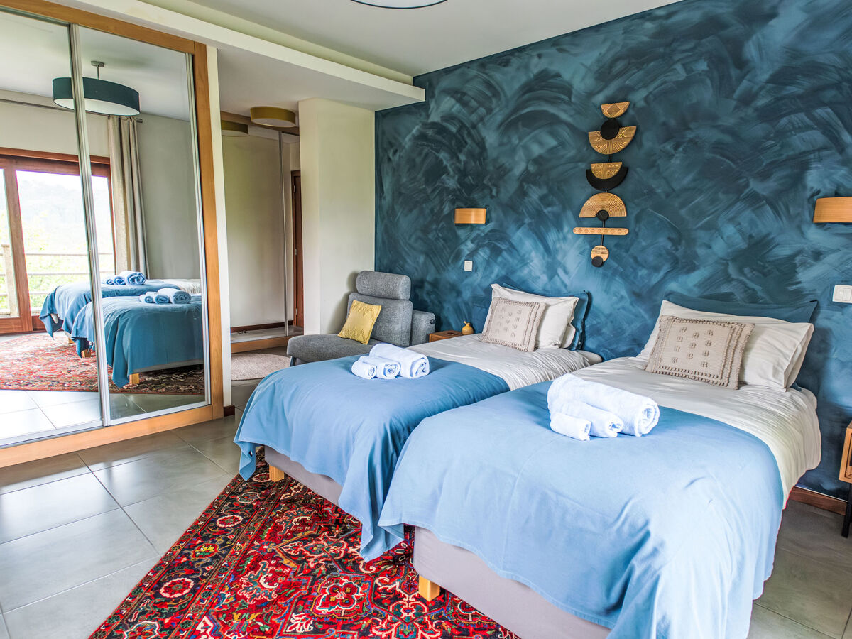 Aménagement très de bon goût et plaisant: 4 chambres, chaque chambre avec: 2 lits (90 cm, longueur 200 cm), douche/WC et radiateur électrique.