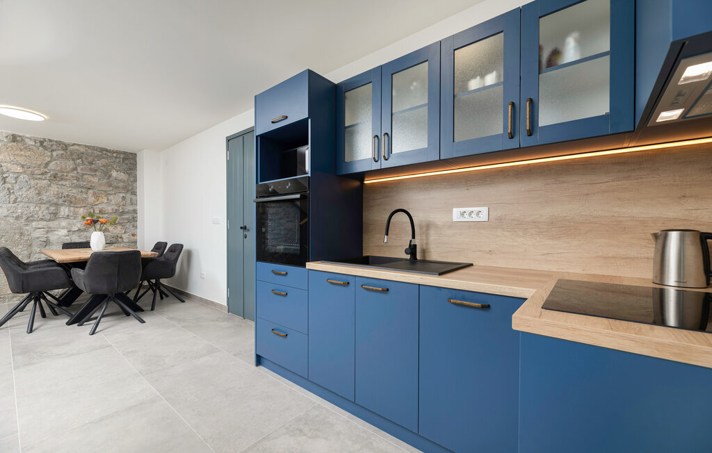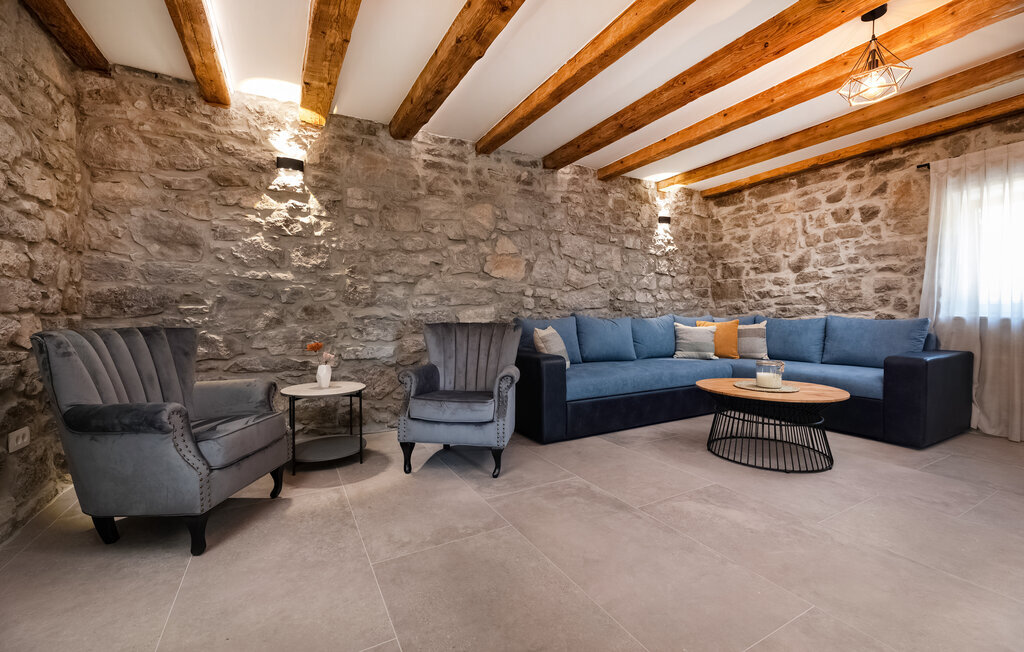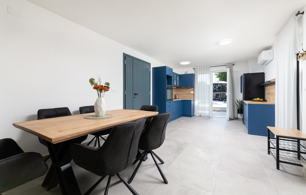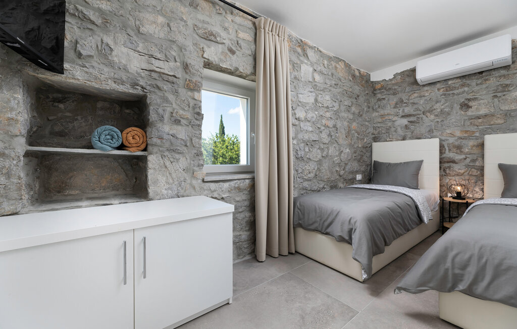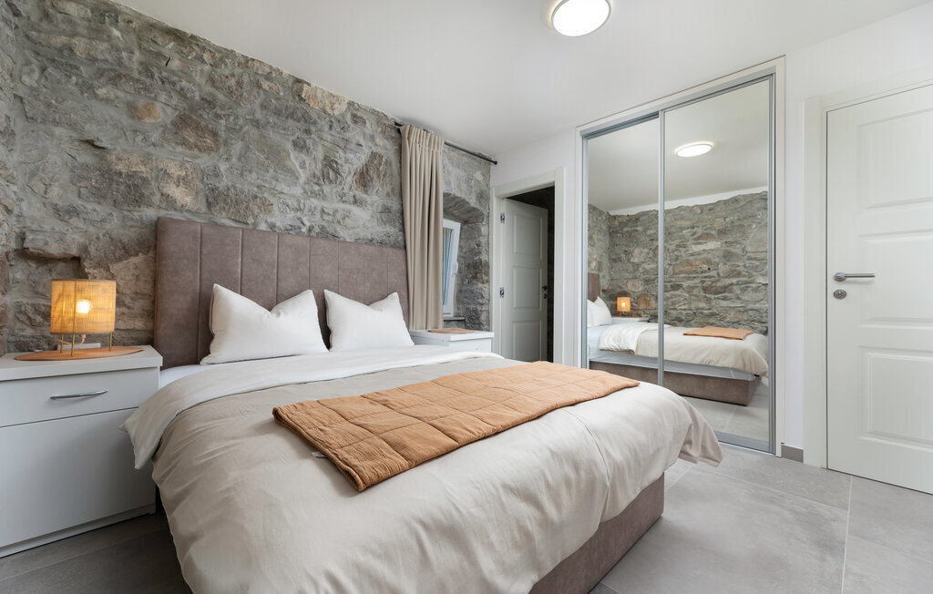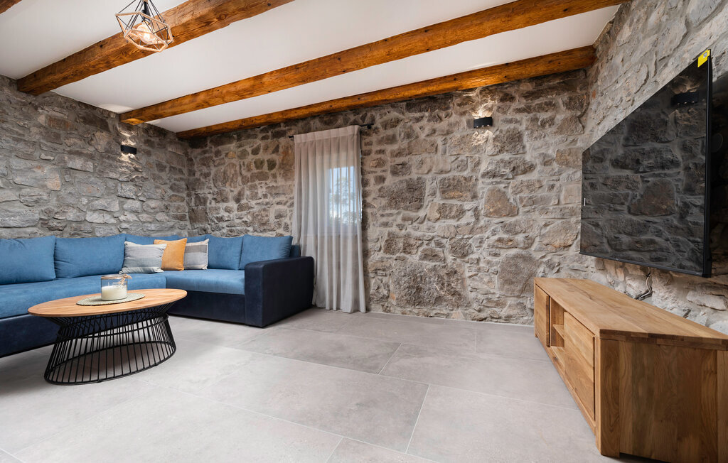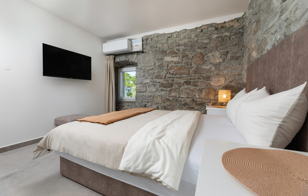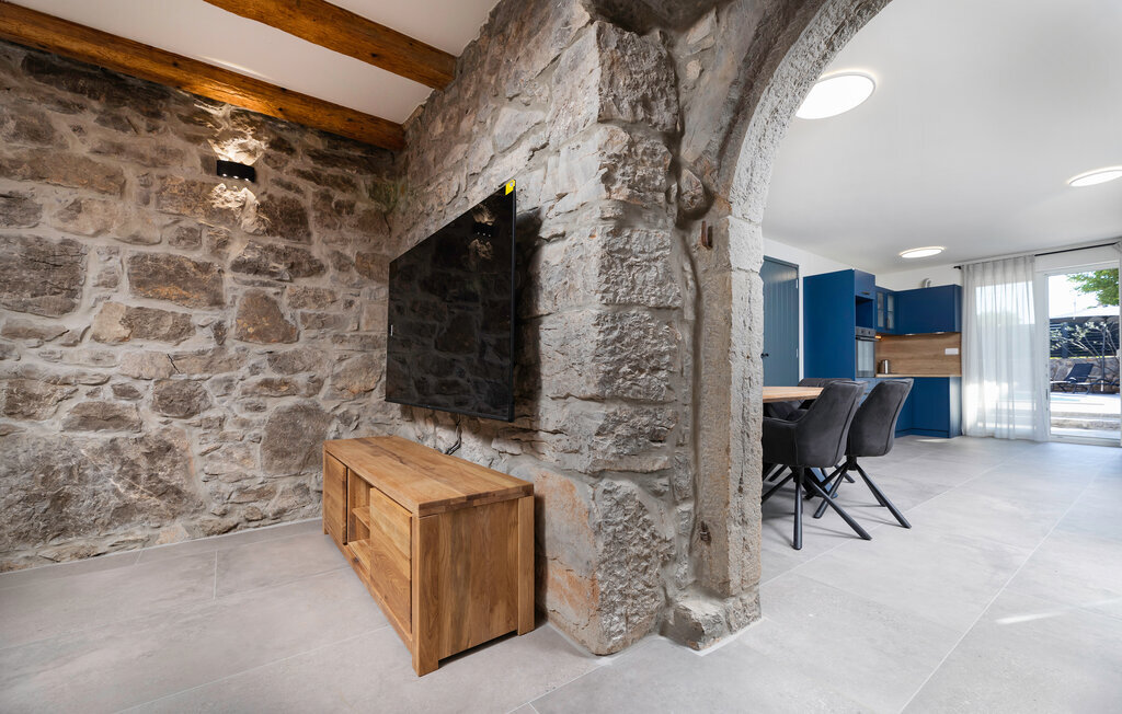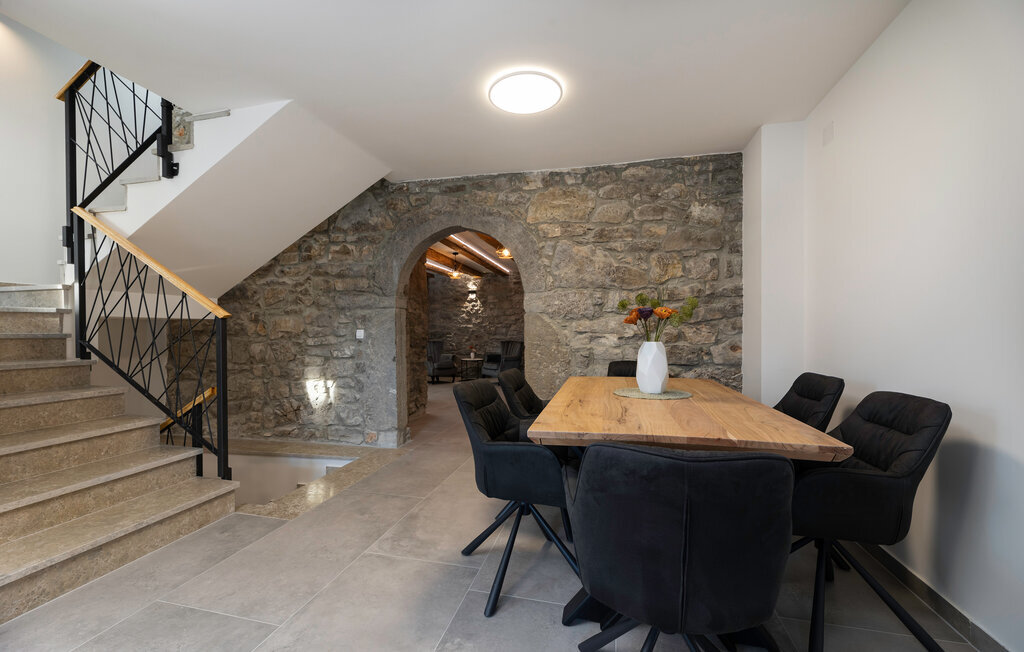 Cette superbe maison vous accueille dans un endroit calme, dans le village de Lakmartin, à proximité de Krk et des plages. Aménagée dans un style traditionnel, elle offre un confort total sur trois étages et est idéale pour une famille ou deux familles d'amis. L'alliance des murs en pierre classiques, de l'ameublement moderne et des couleurs vives vous invite à vous sentir à l'aise dans cette grande maison et à passer vos vacances quotidiennes à cuisiner et à manger dans la cuisine bien équipée. Les pièces confortables séduisent par leur charme, qui se retrouve également dans le jardin. En effet, la piscine et le solarium sont parfaits pour se prélasser et se rafraîchir en plein air.