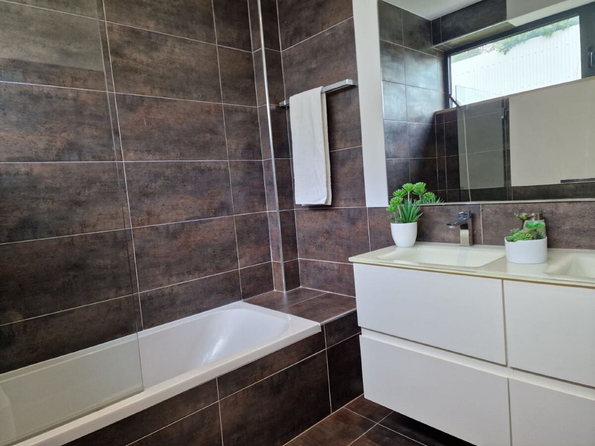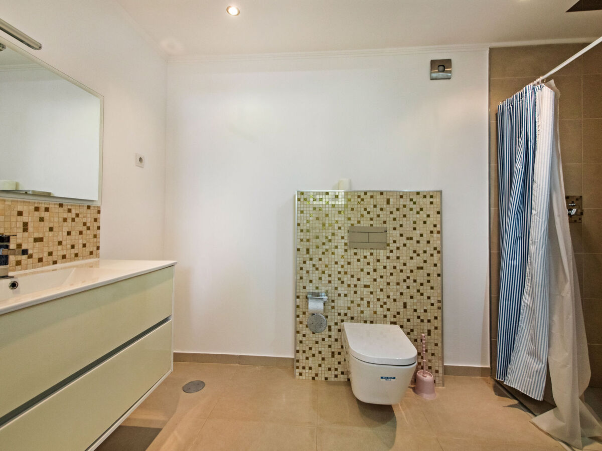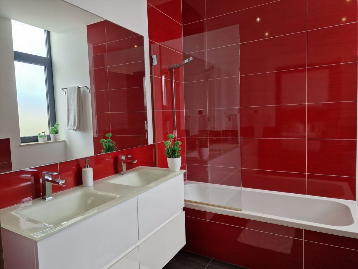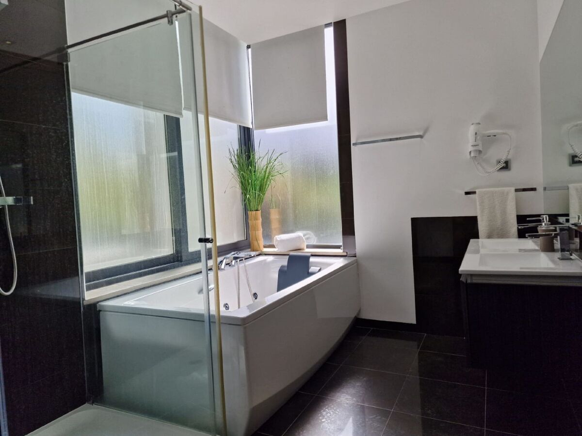 1 chambre avec 1 grand-lit (160 cm, longueur 200 cm), bain/WC, double vasque, air-conditionné et chauffage à air chaud.