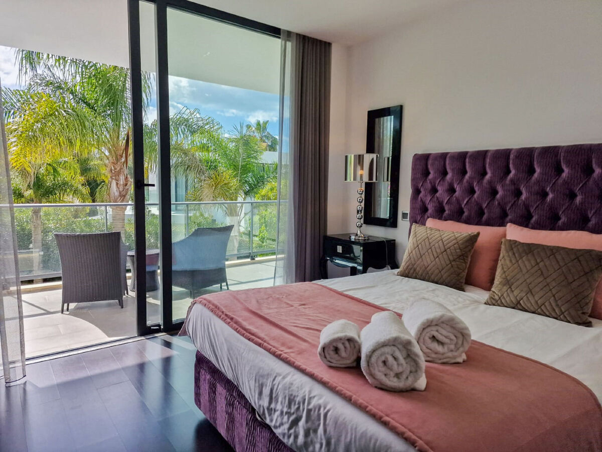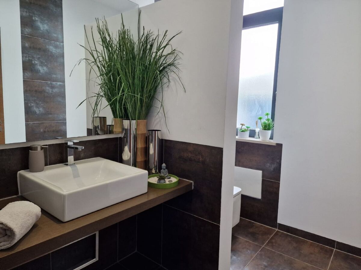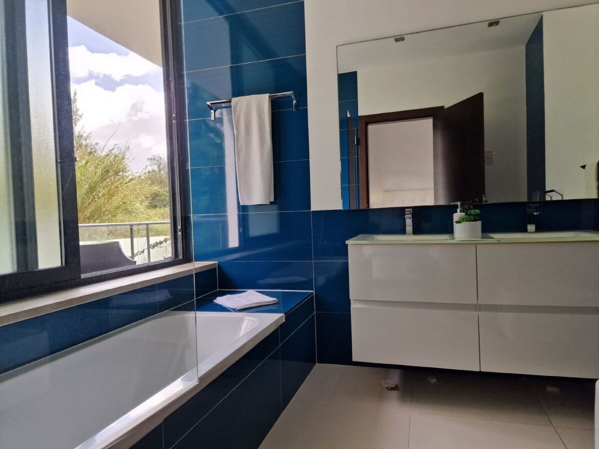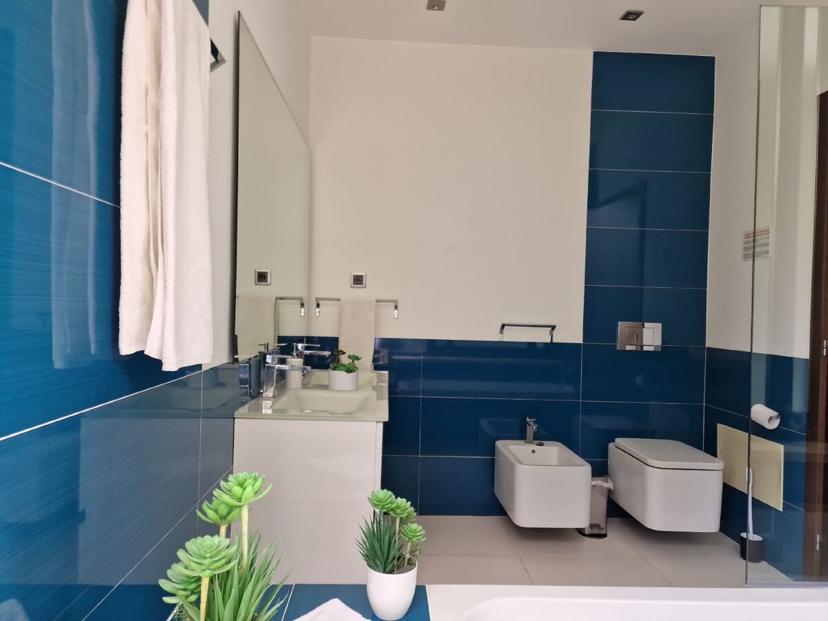 1 chambre avec 1 grand-lit (160 cm, longueur 200 cm), bain/WC, double vasque, air-conditionné et chauffage à air chaud.