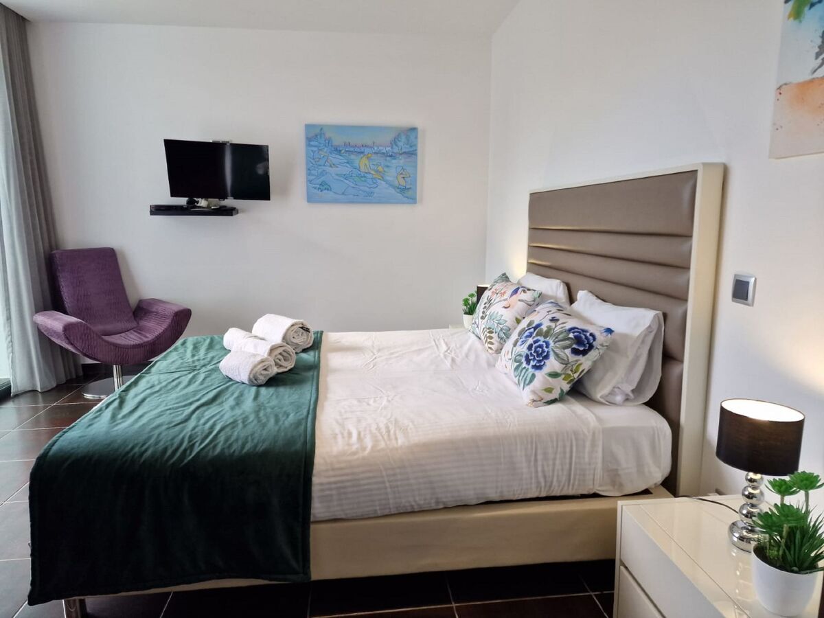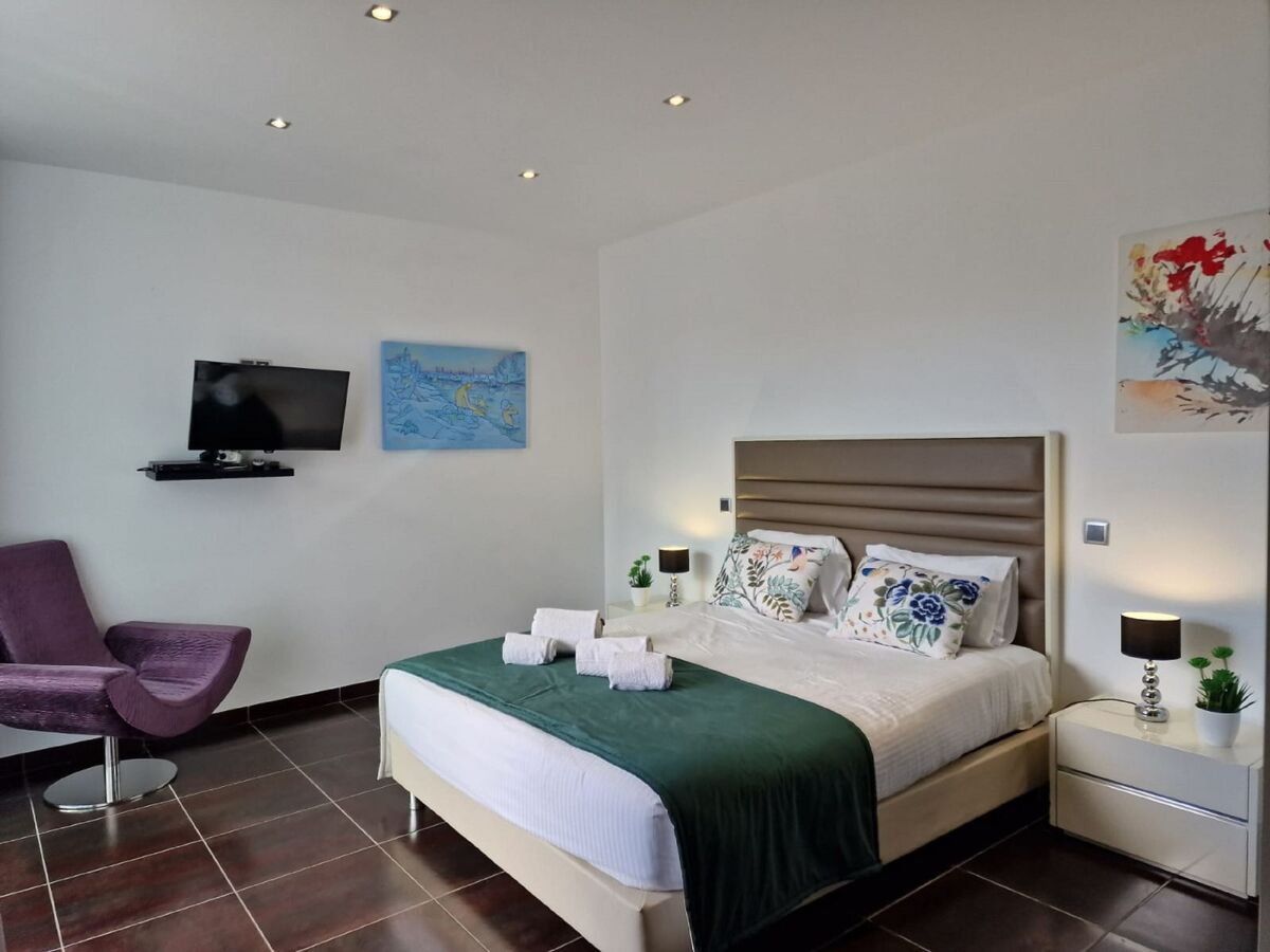 1 chambre avec 1 grand-lit (160 cm, longueur 200 cm), bain/douche/WC, air-conditionné et chauffage à air chaud.