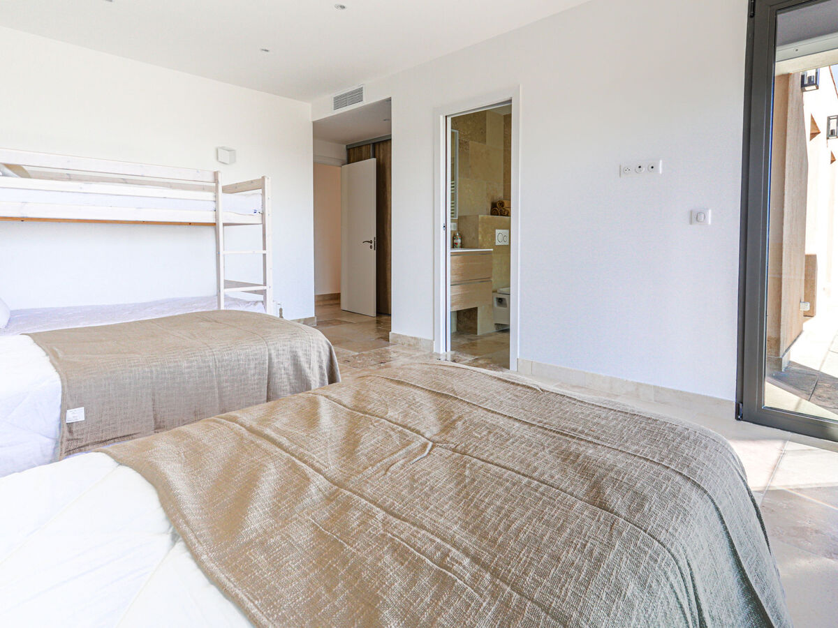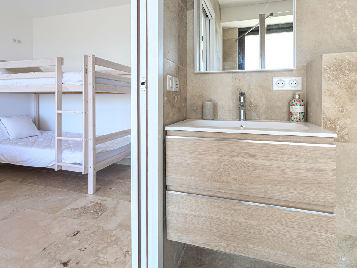 1 grande chambre avec 4 lits (90 cm, longueur 200 cm), lavabo et WC séparés.