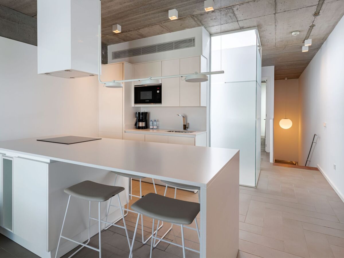 Cuisine ouverte (lave-vaisselle, 3 plaques vitrocéramiques, grille-pain, micro-ondes, congélateur, cafetière électrique) avec air-conditionné.