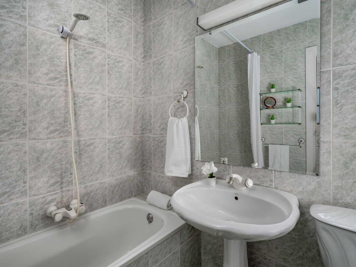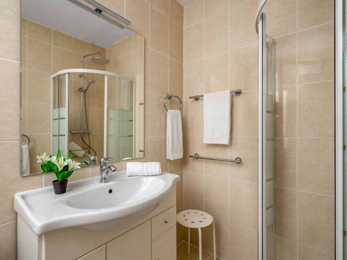 1 chambre avec 2 lits (90 cm, longueur 190 cm), douche/WC, radiateur et air-conditionné.