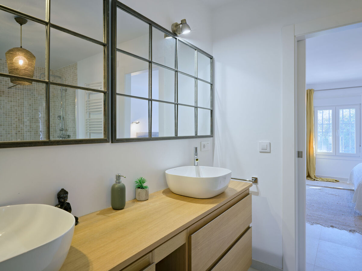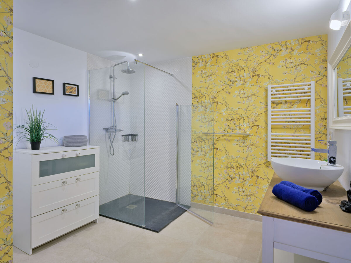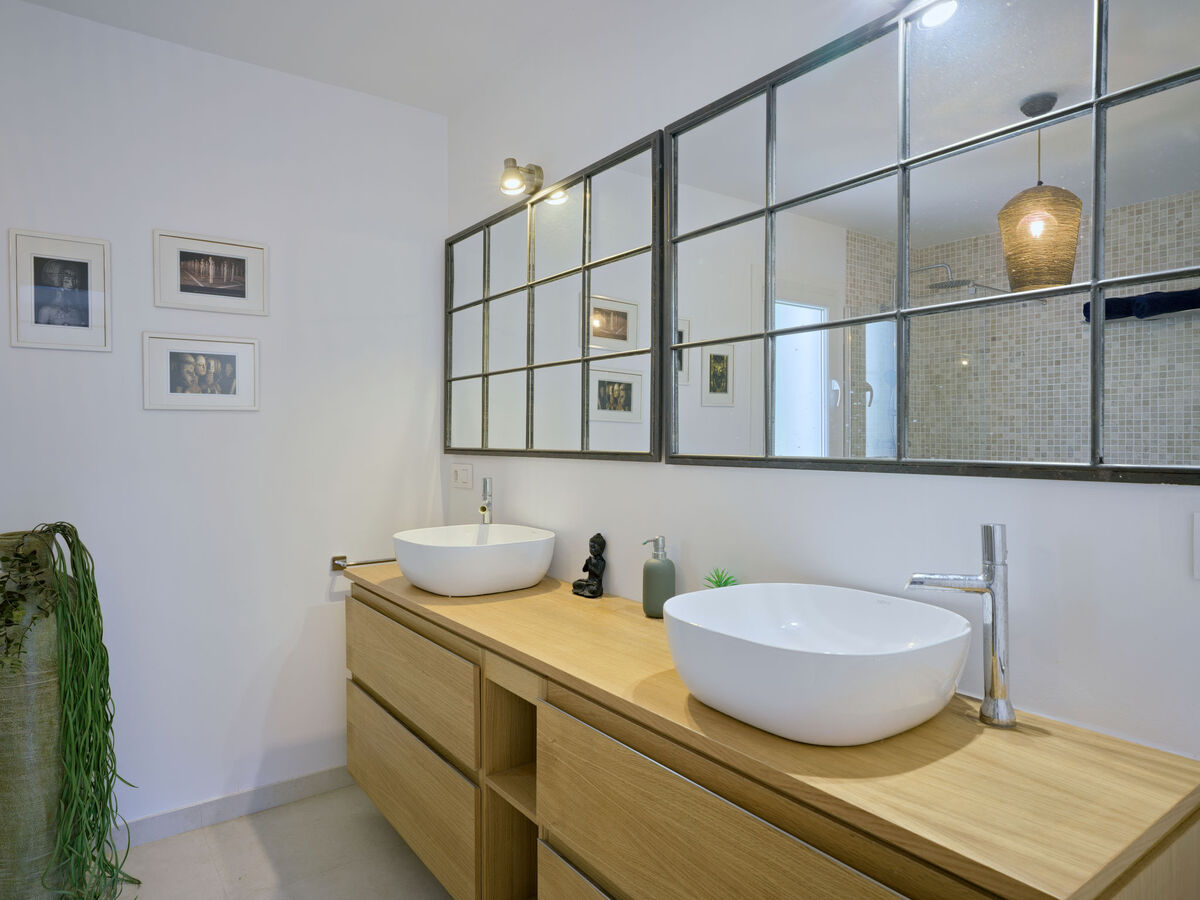 1 chambre avec 1 grand-lit (180 cm, longueur 200 cm), douche/WC, double vasque et air-conditionné.