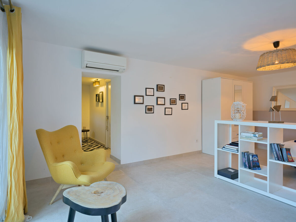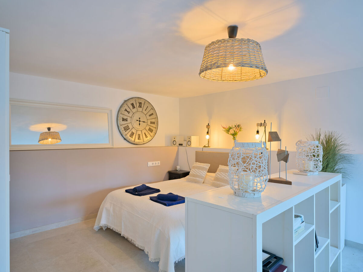 À l'étage inférieur: (escalier extérieur) 1 chambre avec 1 grand-lit (160 cm, longueur 200 cm), douche/WC et air-conditionné.