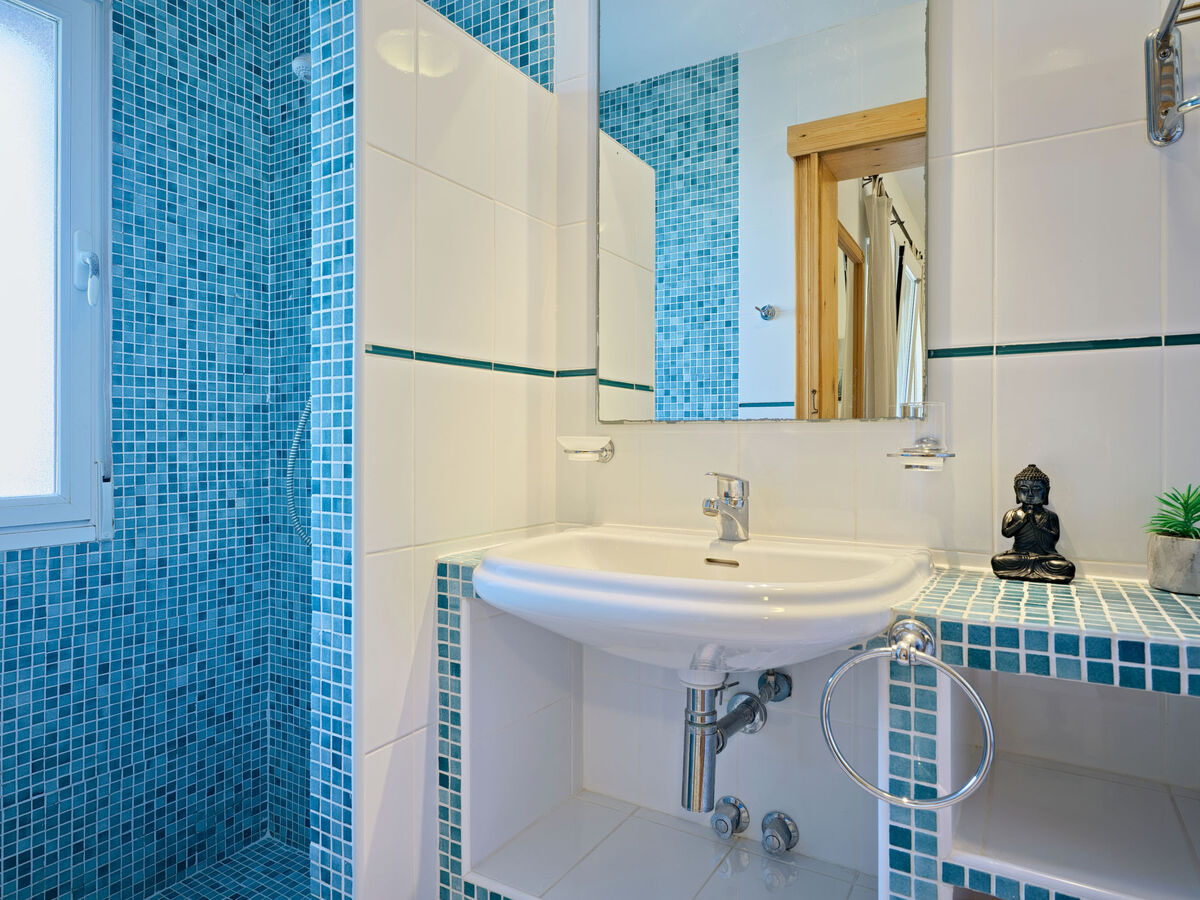 1 chambre, fenêtre donnant sur le séjour avec 1 lit double (2 x 90 cm, longueur 200 cm), douche/WC, air-conditionné et chauffage à air chaud.