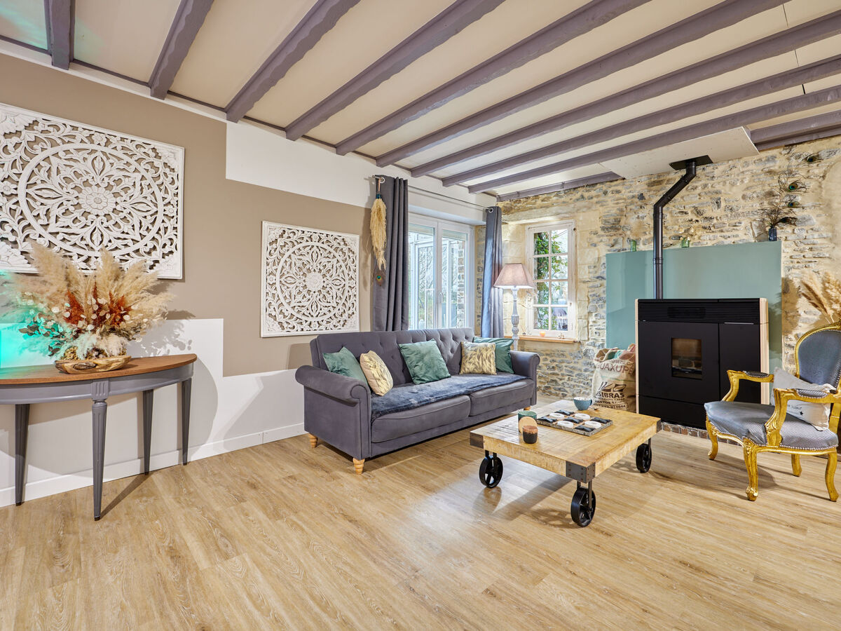 Aménagement confortable et plaisant: séjour/salle à manger avec TV, écran plat et poêle à bois.