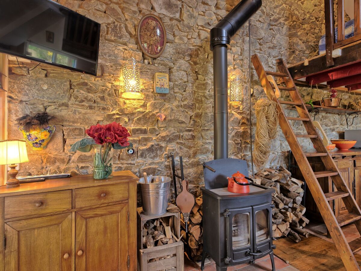 Aménagement plaisant et avec beaucoup de bois: séjour/salle à manger avec 1 divan-lit (140 cm, longueur 180 cm), poêle suédois, table pour les repas, bibliotheque et TV (écran plat).