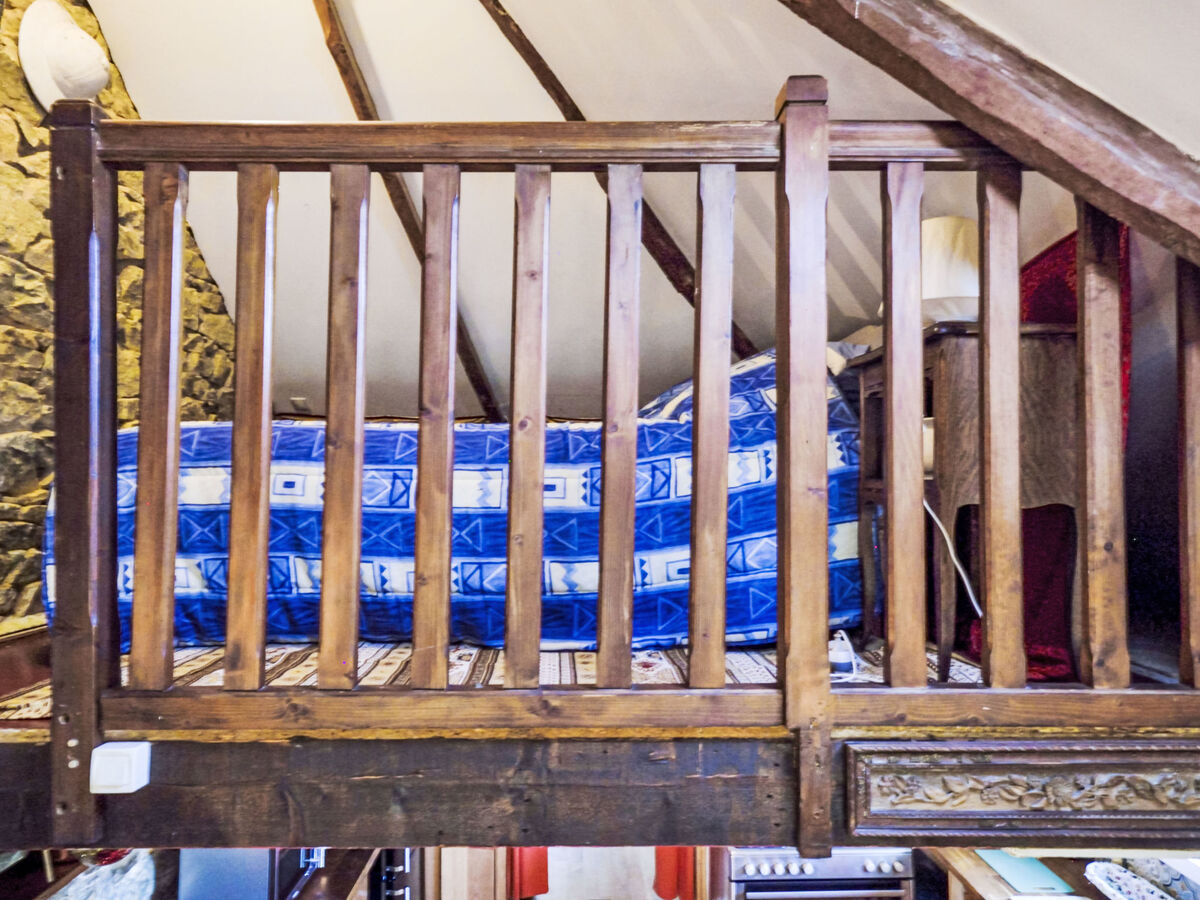 À l'étage supérieur: (échelle) galerie ouverte avec 1 grand-lit (140 cm, longueur 190 cm).