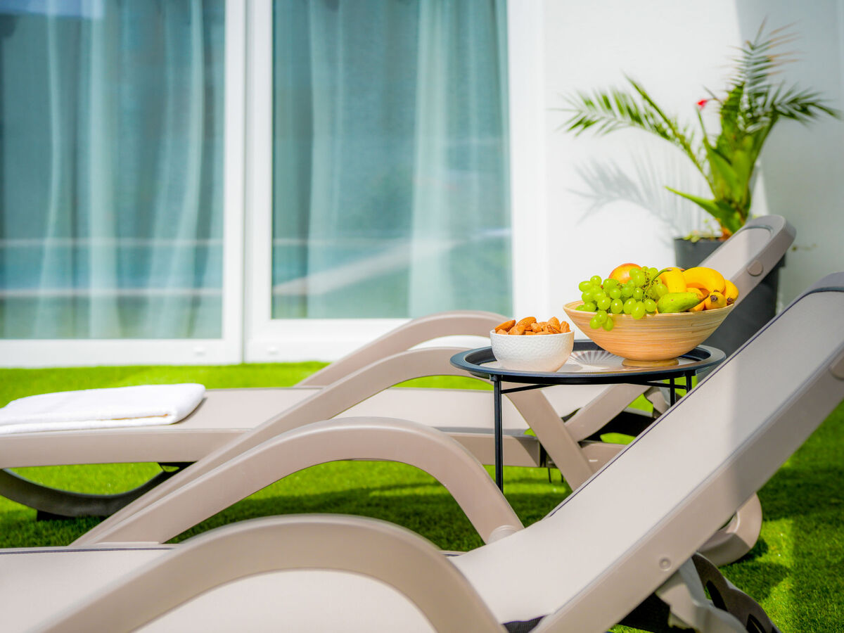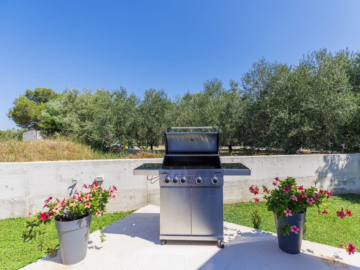 Meubles de terrasse, barbecue (portable), chaises longues.