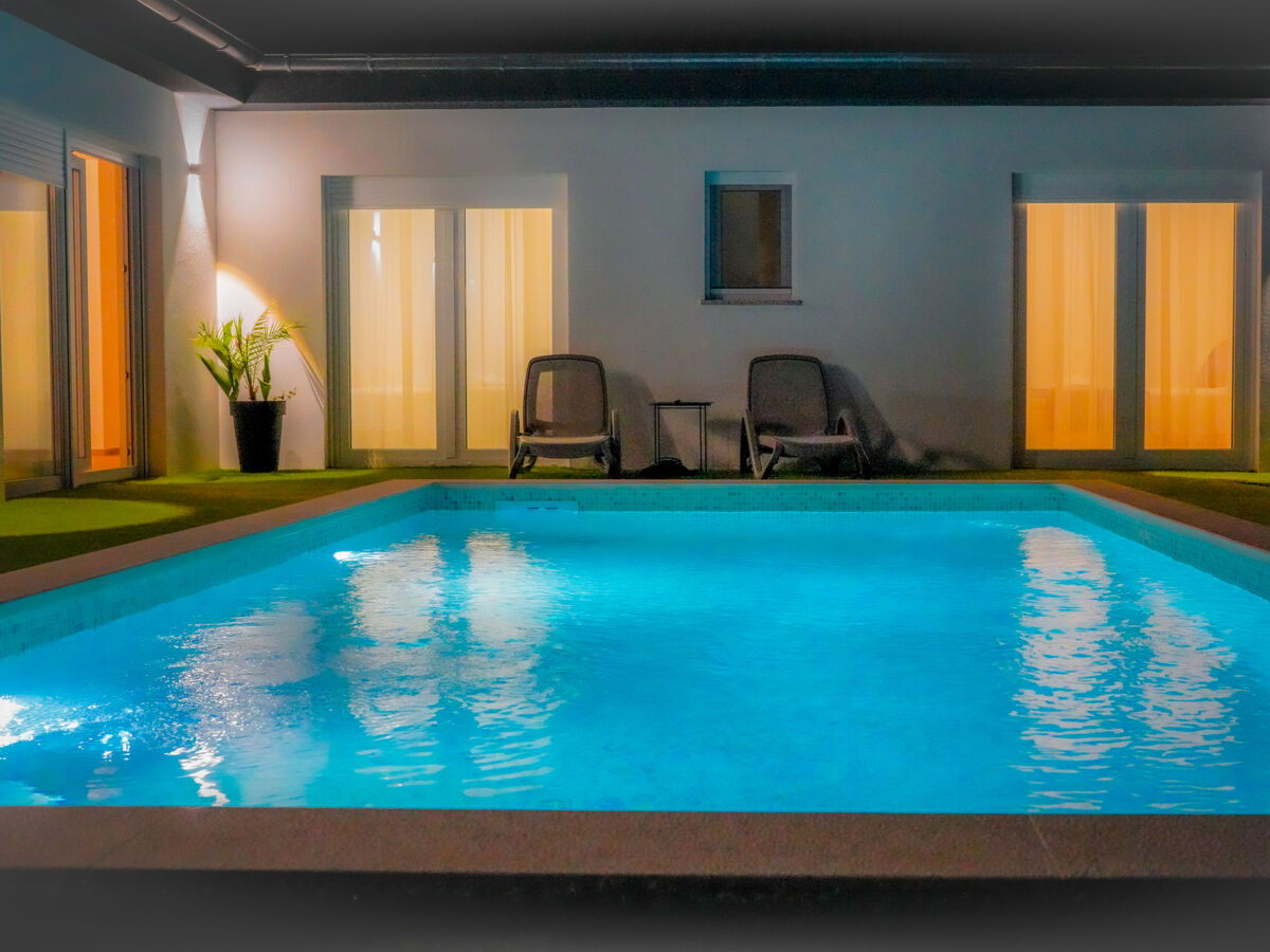 A usage privé: terrain 630 m2 (clôturé), jardin avec pelouse et fleurs, piscine rectangulaire (8 x 4 m, profondeur 140 cm, disponibilité saisonnière: 15.Avr.