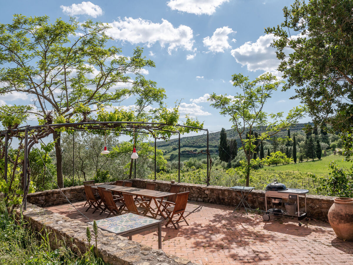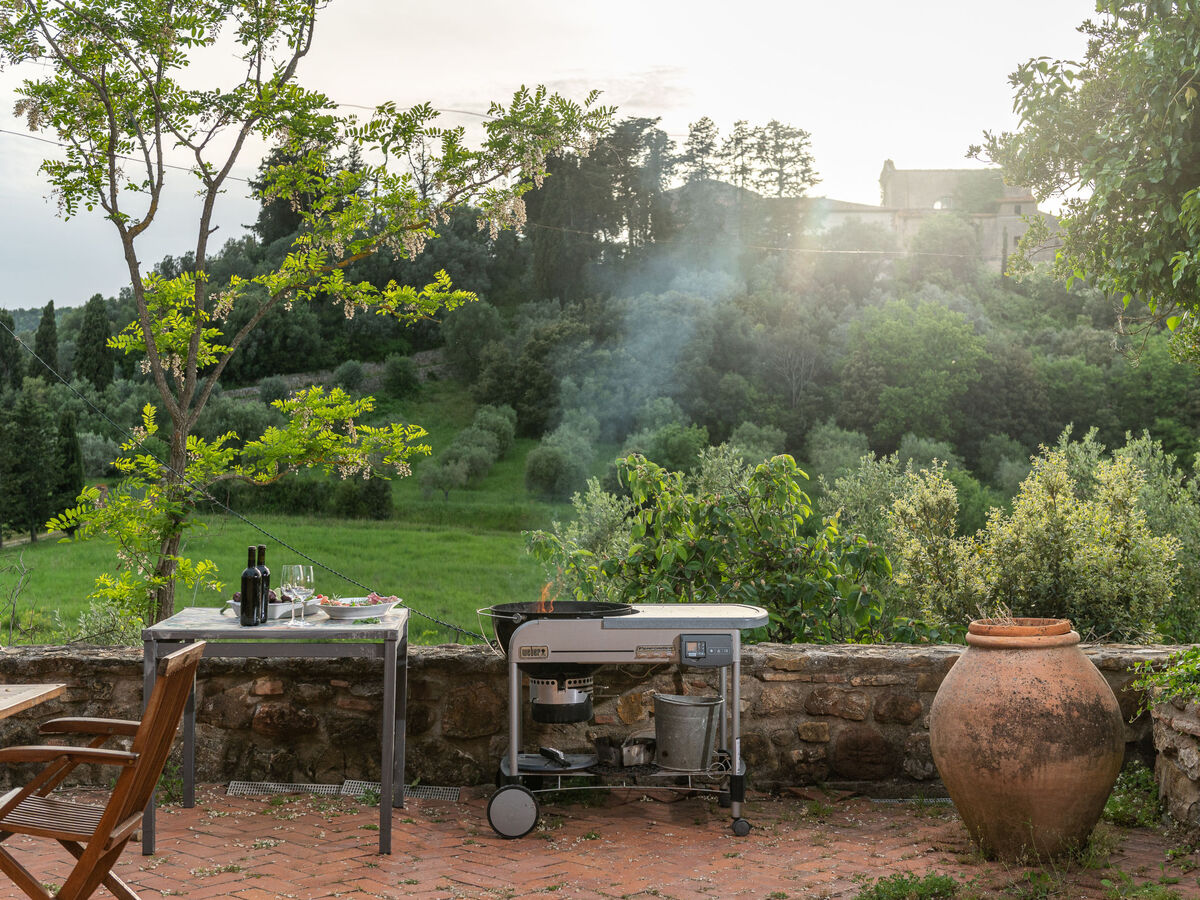 Une grande table pour les repas en plein air est située sur une grande terrasse et est équipée d'un barbecue à côté.
