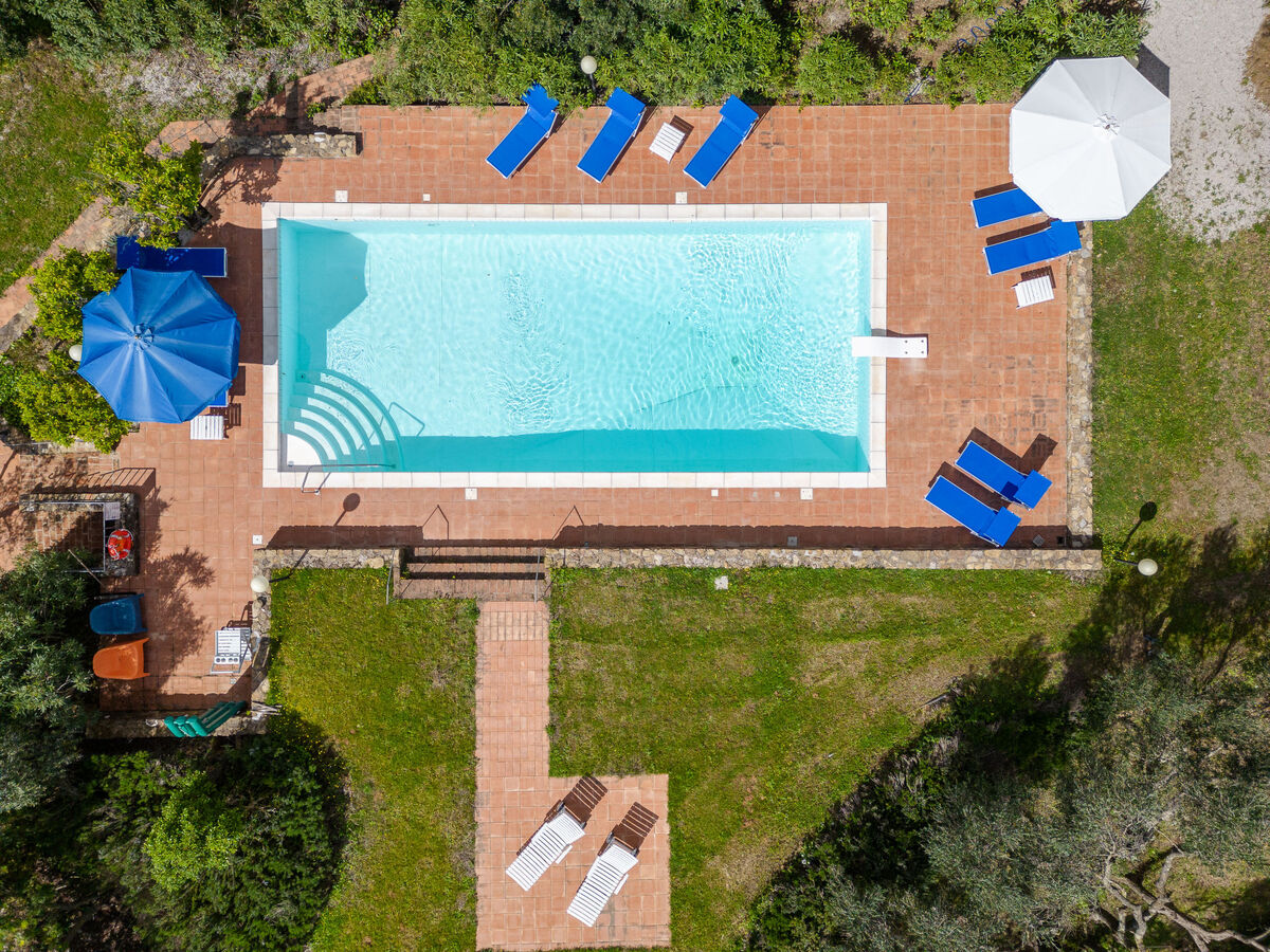 La piscine rectangulaire jouit d'une intimité absolue et en même temps d'une vue magnifique sur la campagne de la Maremme jusqu'au golfe de Follonica.