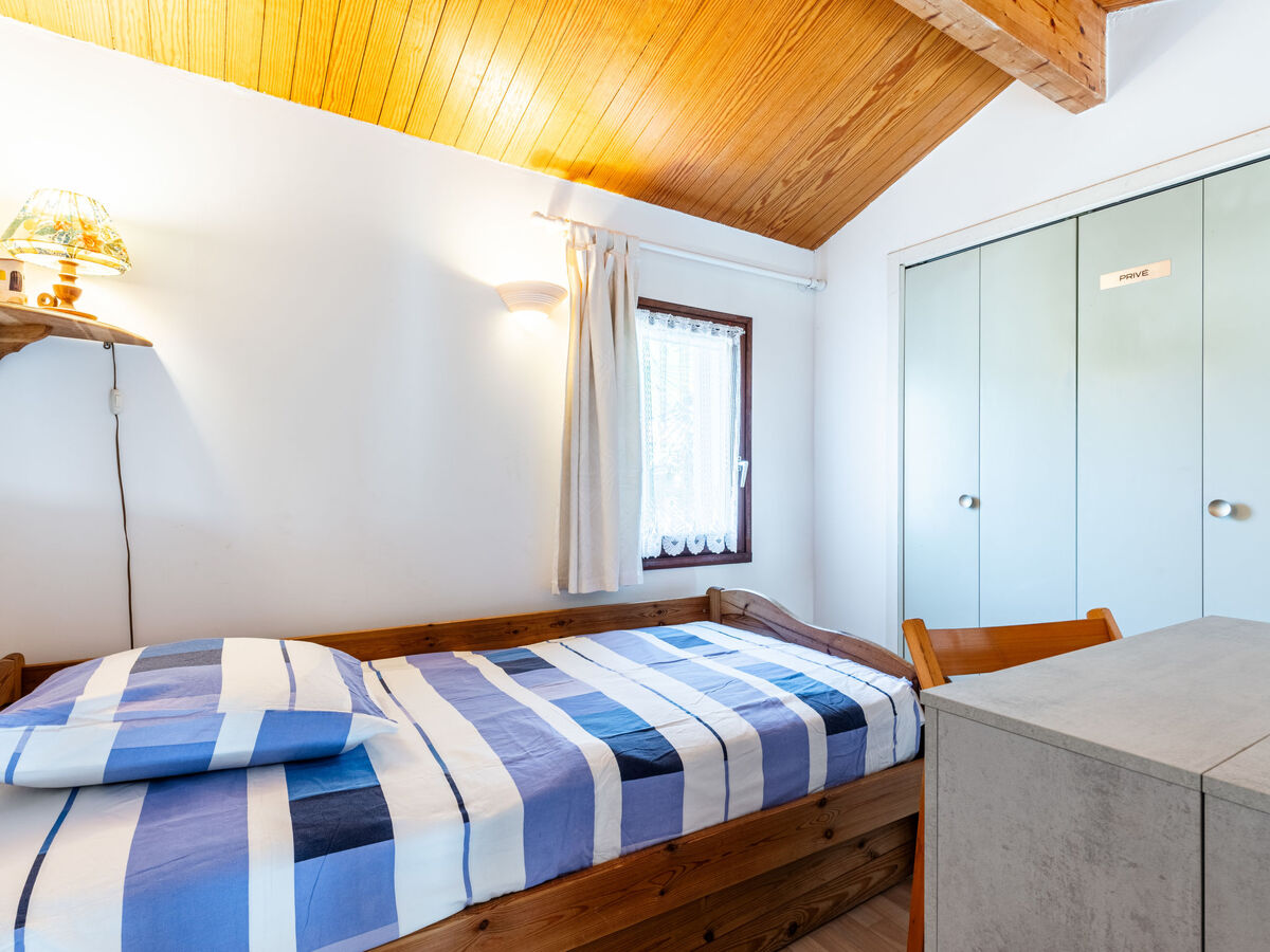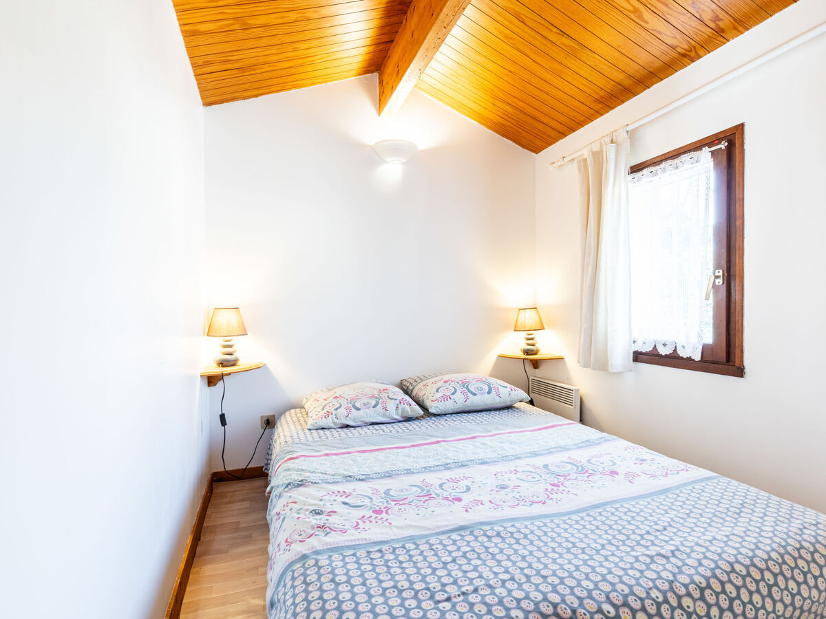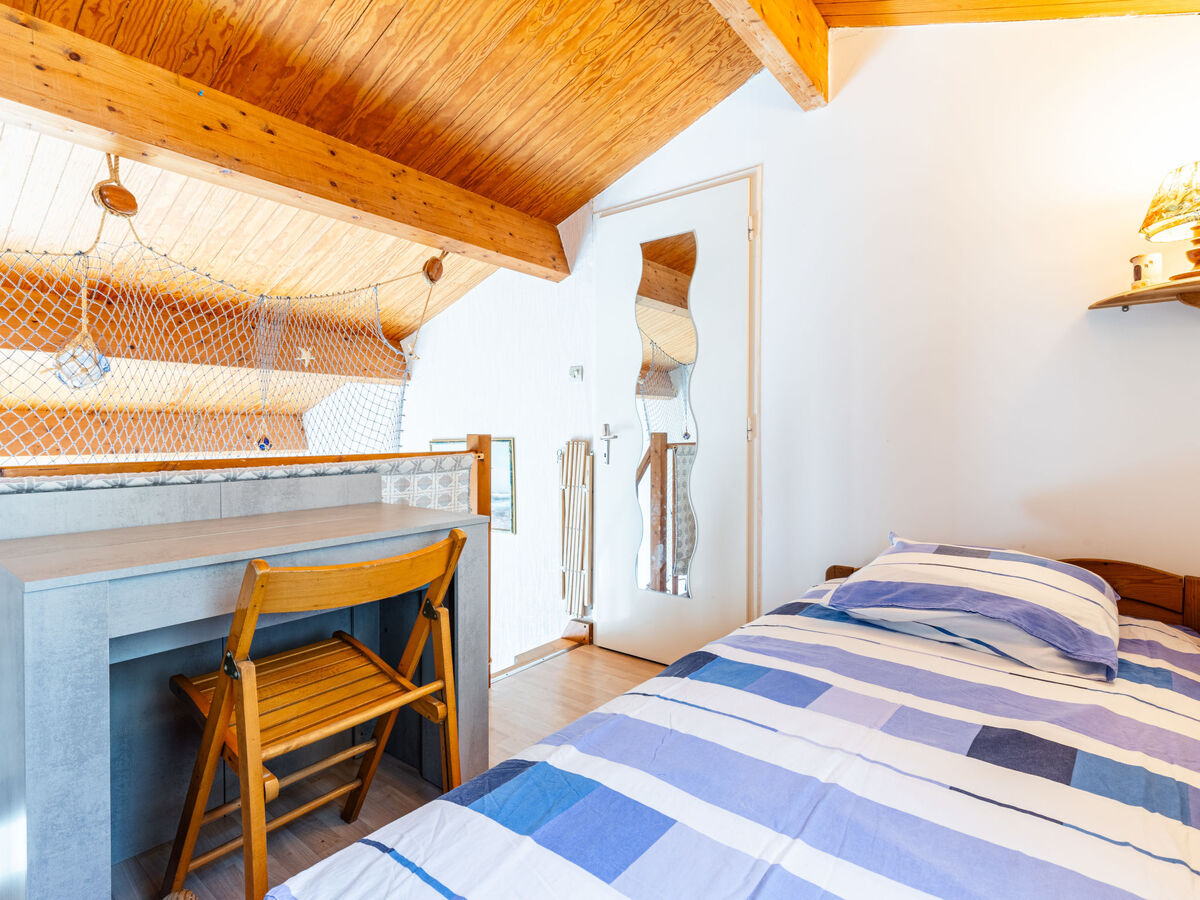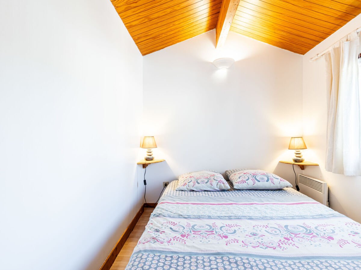 À l'étage supérieur: 1 chambre, mansardée avec 1 grand-lit (1 x 140 cm, longueur 190 cm).