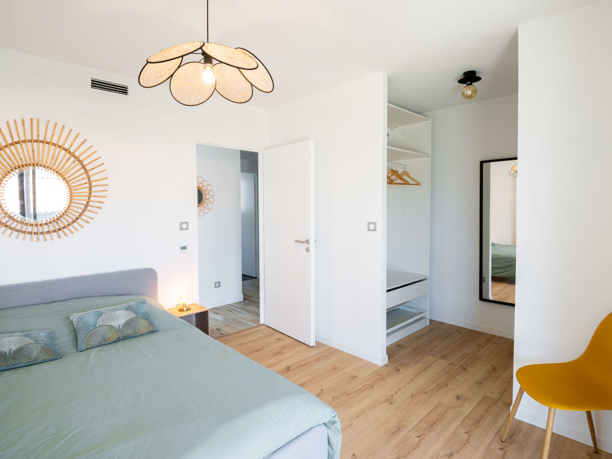 1 chambre avec Dressing avec 1 grand-lit (1 x 160 cm, longueur 200 cm), lavabo et douche.