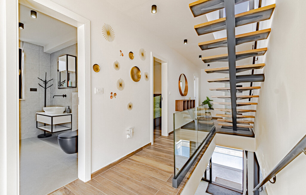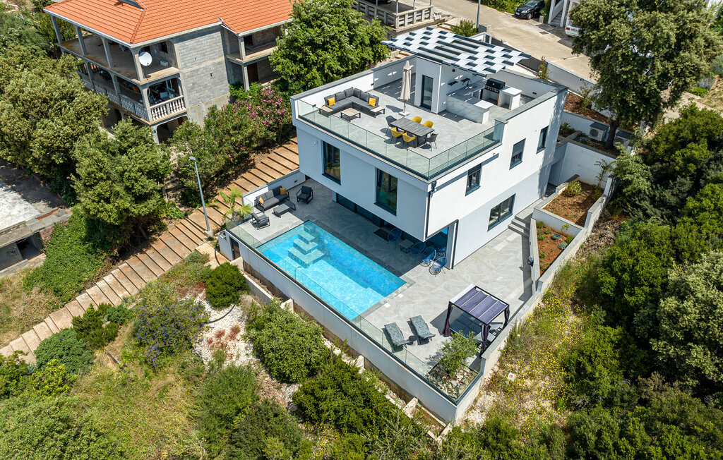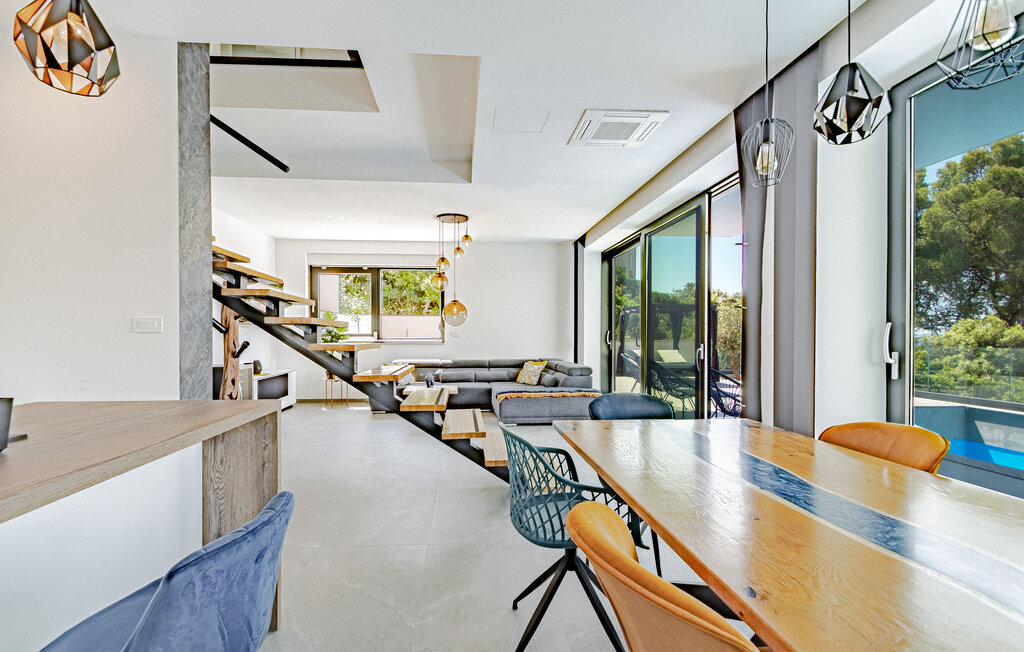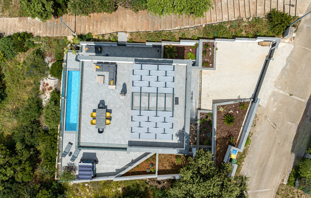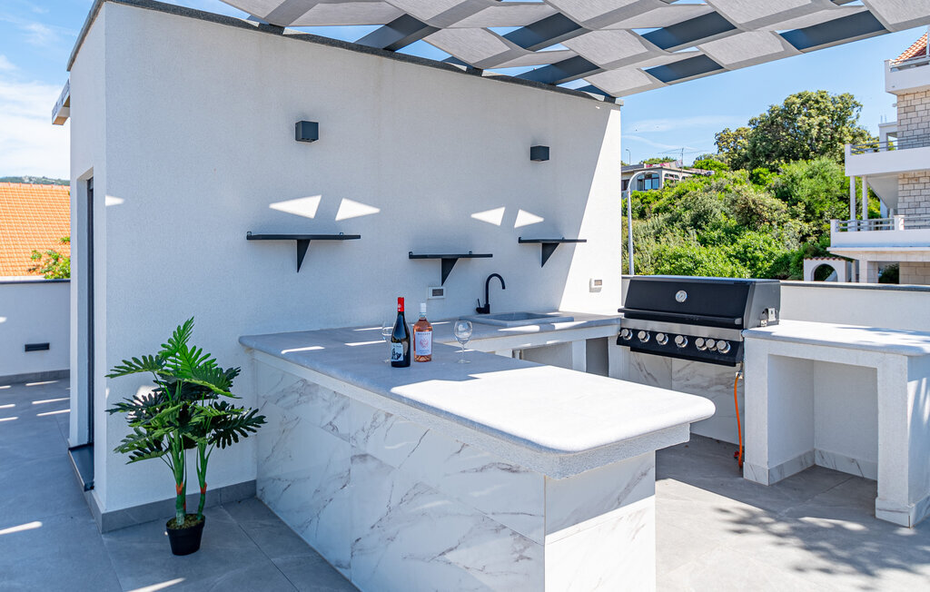 L'espace extérieur n'est pas en reste puisqu'une belle piscine et des chaises longues vous invitent à vous détendre avec vue sur la mer. Un point fort particulier est la grande terrasse sur le toit, avec cuisine d'été et meubles de jardin, qui invitent à s'attarder et à profiter de la vie.