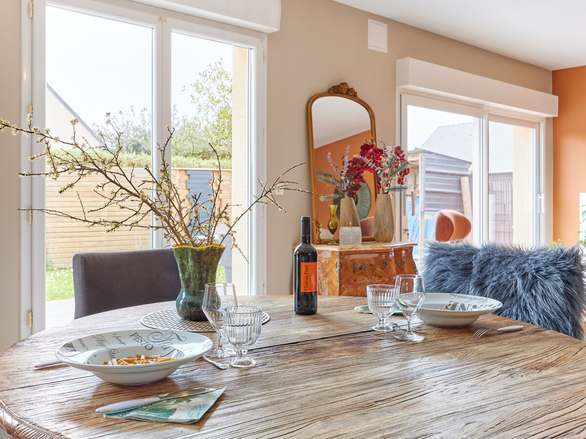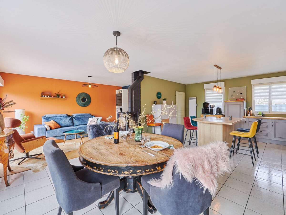 Aménagement confortable et agréable: séjour/salle à manger avec chauffage électrique et poêle à bois.