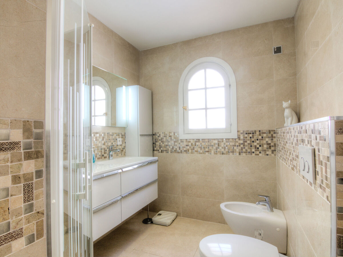 1 chambre avec 1 grand-lit (2 x 80 cm, longueur 200 cm), bidet, douche/WC et air-conditionné.