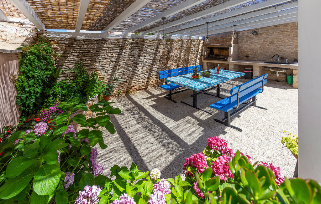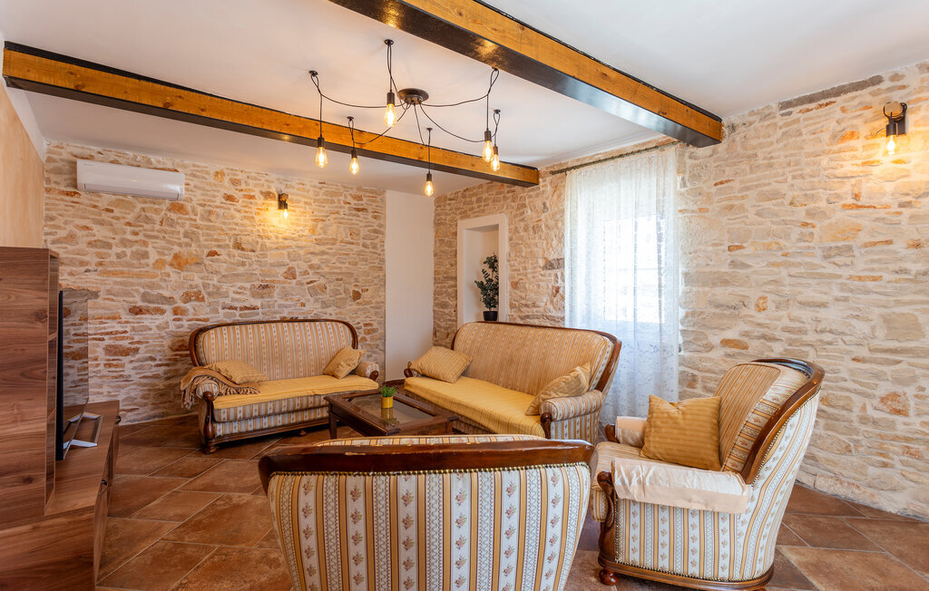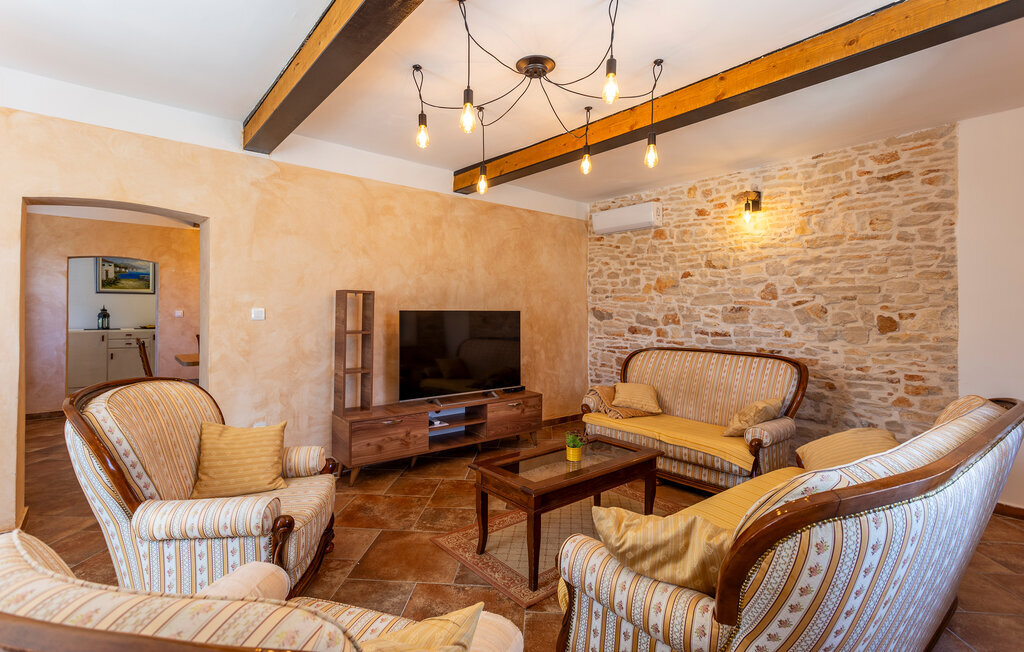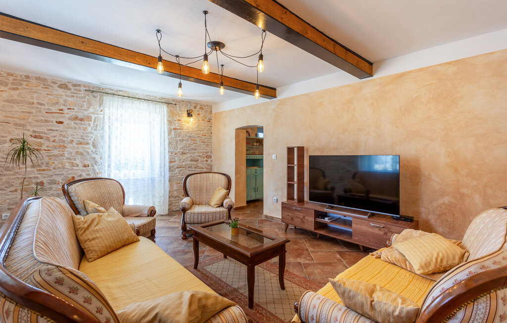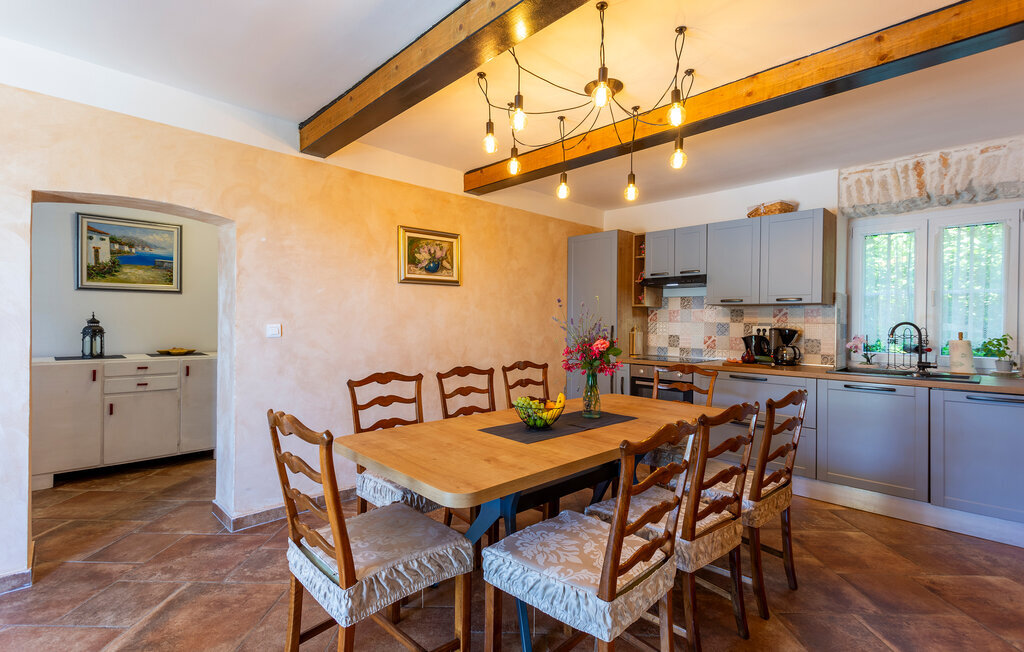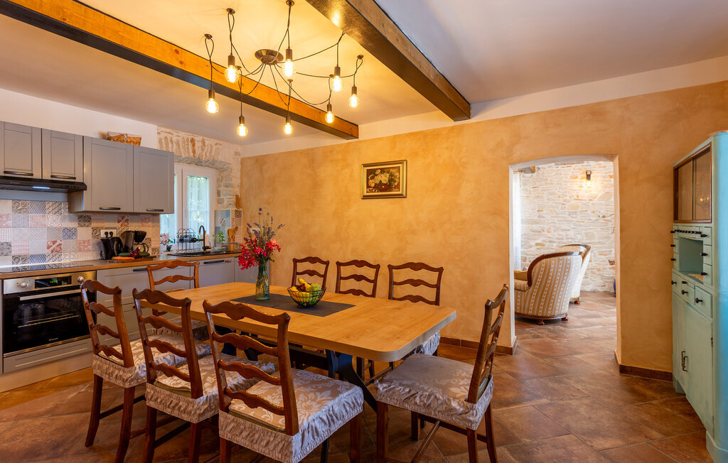 Cette magnifique maison en pierre d'Istrie allie le charme rustique au confort moderne. Les pièces intérieures, aménagées avec goût, dégagent une atmosphère chaleureuse et accueillante. Dans le vaste espace de vie, vous trouverez tout ce dont vous avez besoin pour passer des vacances reposantes. Organisez une soirée cinéma ou réunissez-vous dans la grande cuisine-salle à manger pour cuisiner ensemble.