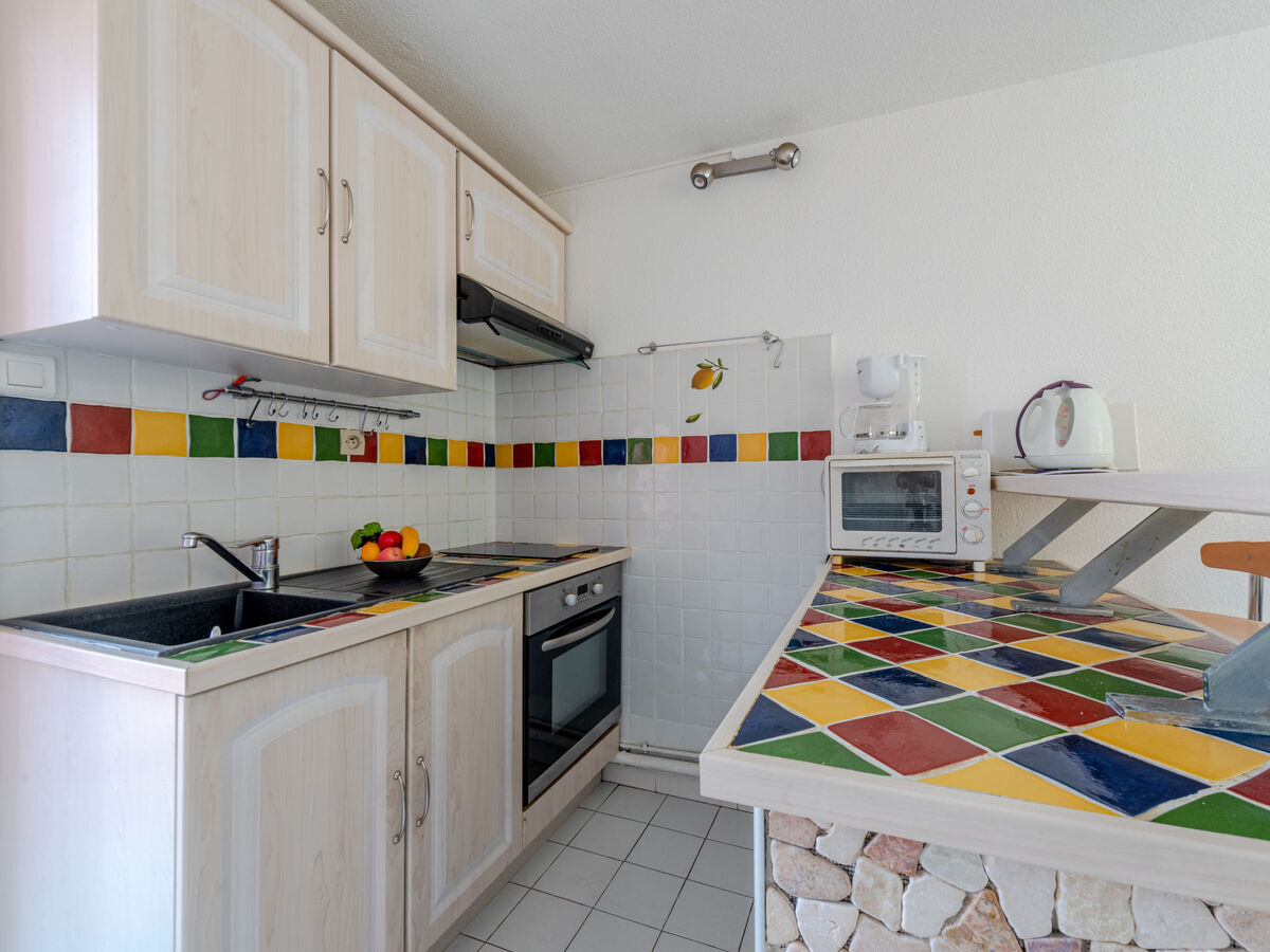 Coin cuisine (four, 2 plaques vitrocéramiques, grille-pain, bouilloire électrique, micro-ondes, congélateur, cafetière électrique).