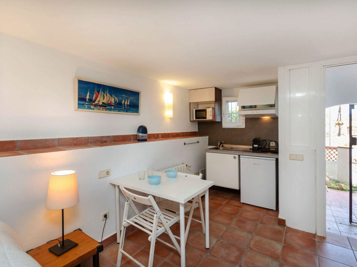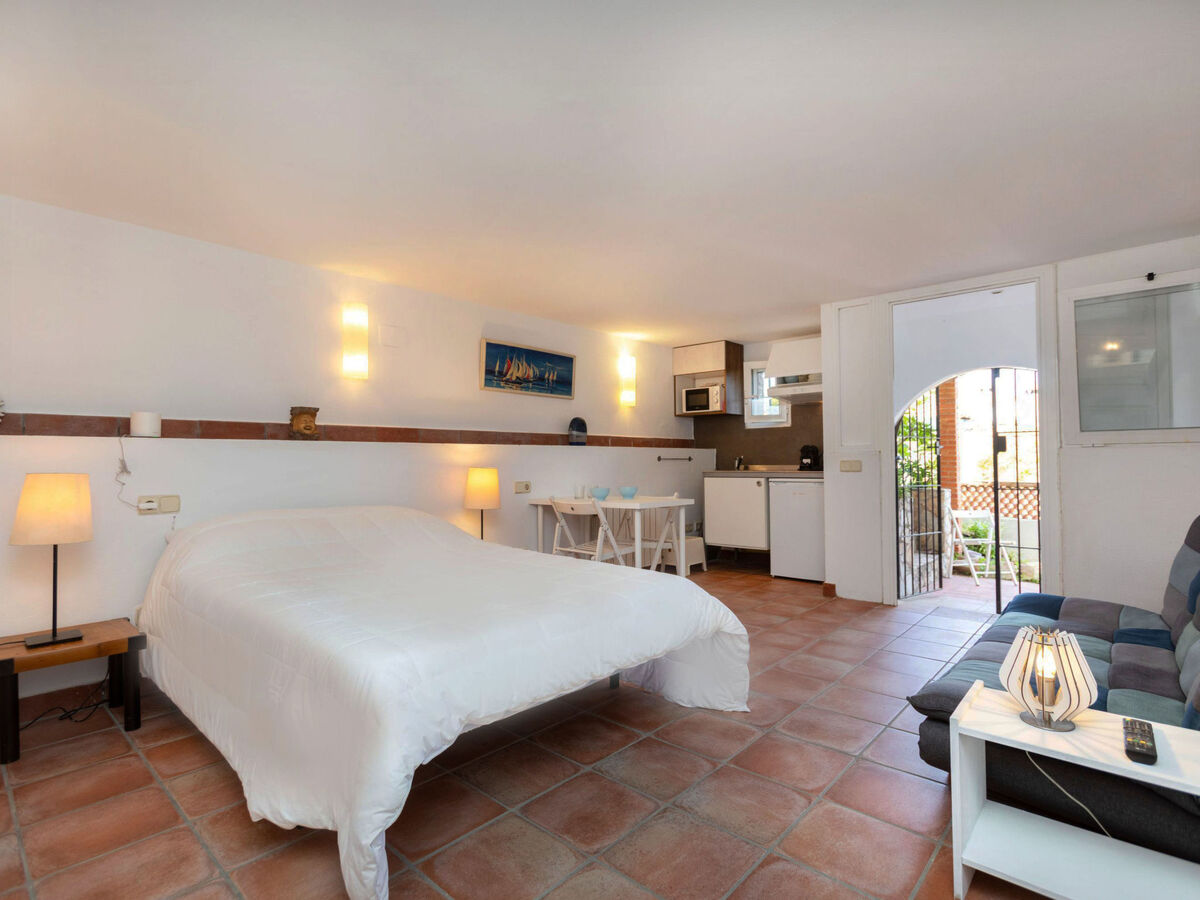 Studio avec 1 grand-lit (150 cm, longueur 190 cm), coin-cuisine, douche/bidet/WC et Télévision numérique.