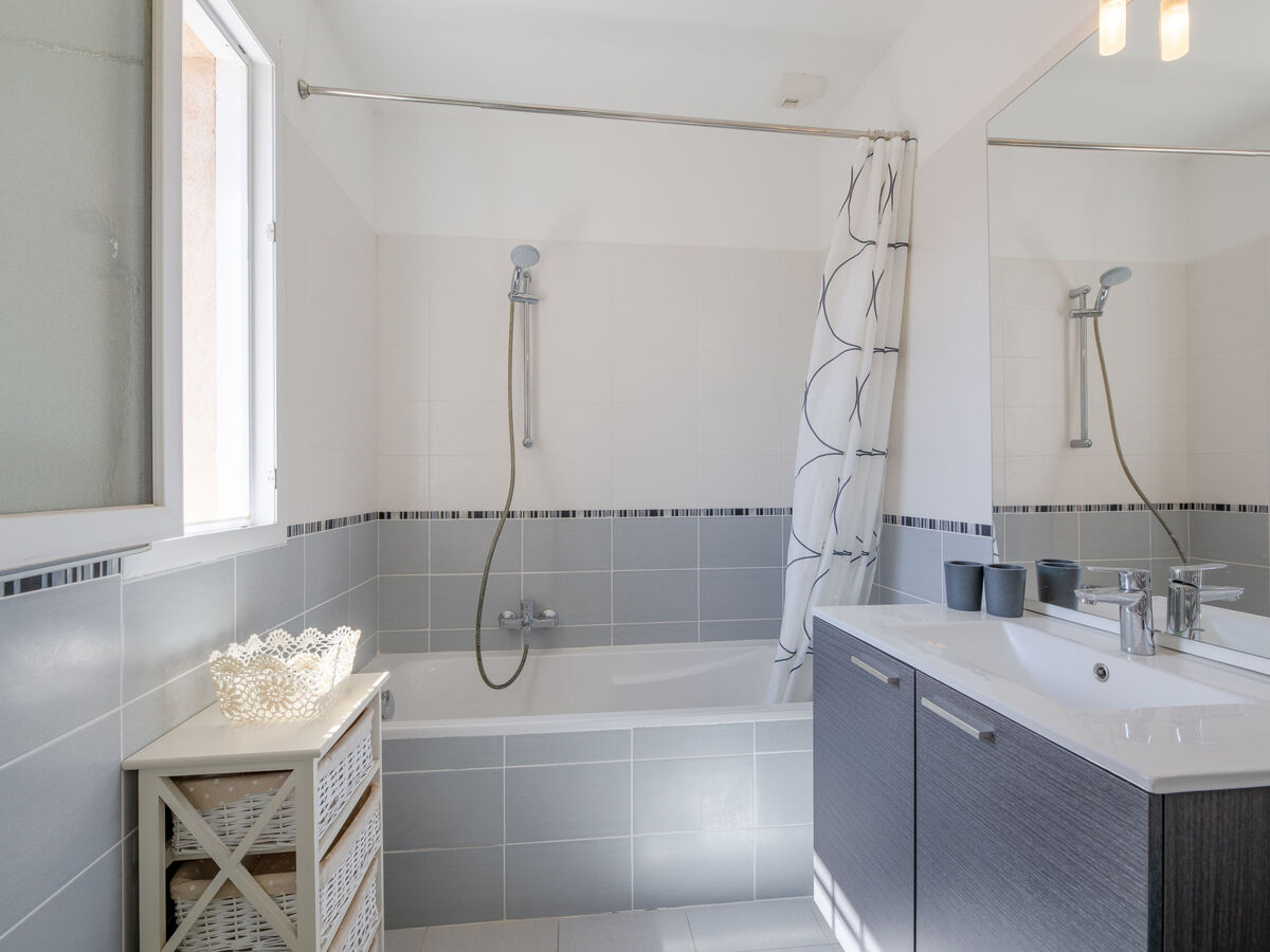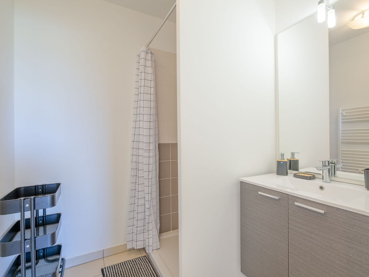 1 chambre avec 1 grand-lit (1 x 160 cm, longueur 200 cm), salle de bains.