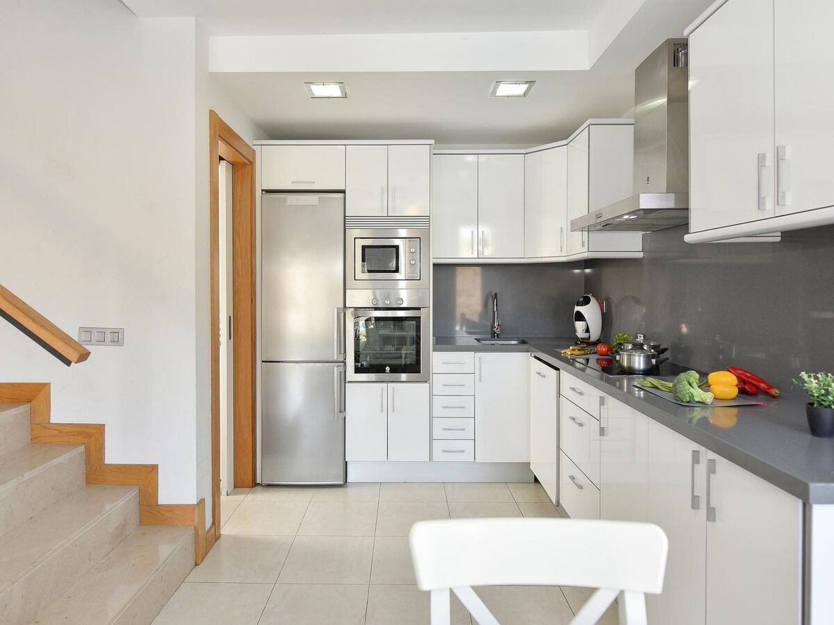 Cuisine ouverte (four, lave-vaisselle, 4 plaques vitrocéramiques, grille-pain, bouilloire électrique, micro-ondes, congélateur, cafetière électrique).