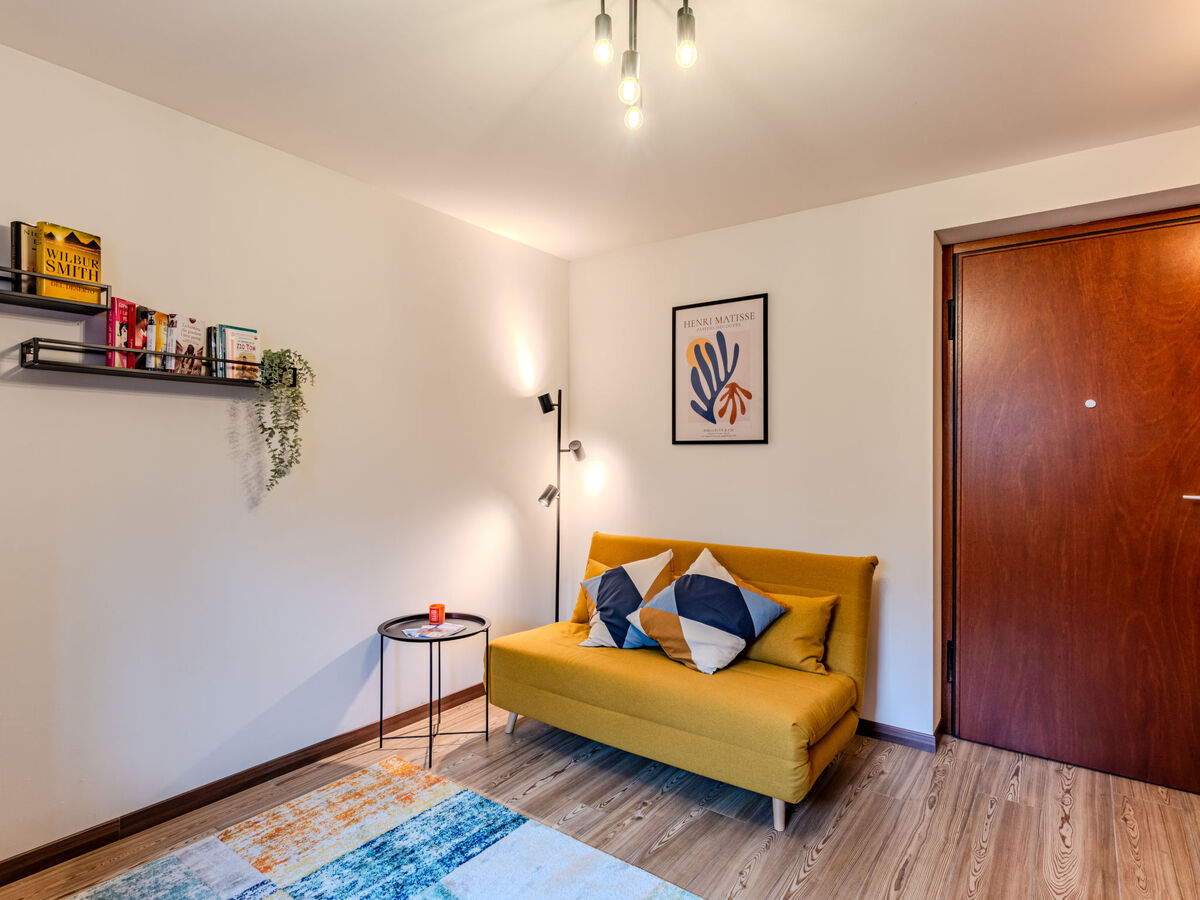 Clair, partiellement mansardé, complètement rénové en 2023, aménagement confortable et moderne: séjour ouvert avec 1 divan-lit et TV.