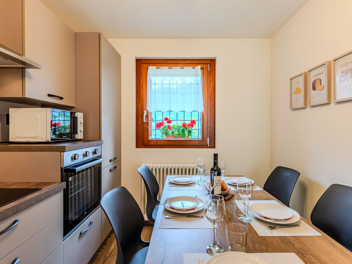 Cuisine ouverte (four, lave-vaisselle, 4 plaques à induction, grille-pain, bouilloire électrique, micro-ondes, cafetière électrique, Capsules pour machine à café (Nescafè Dolcegusto) inclus) avec table pour les repas.
