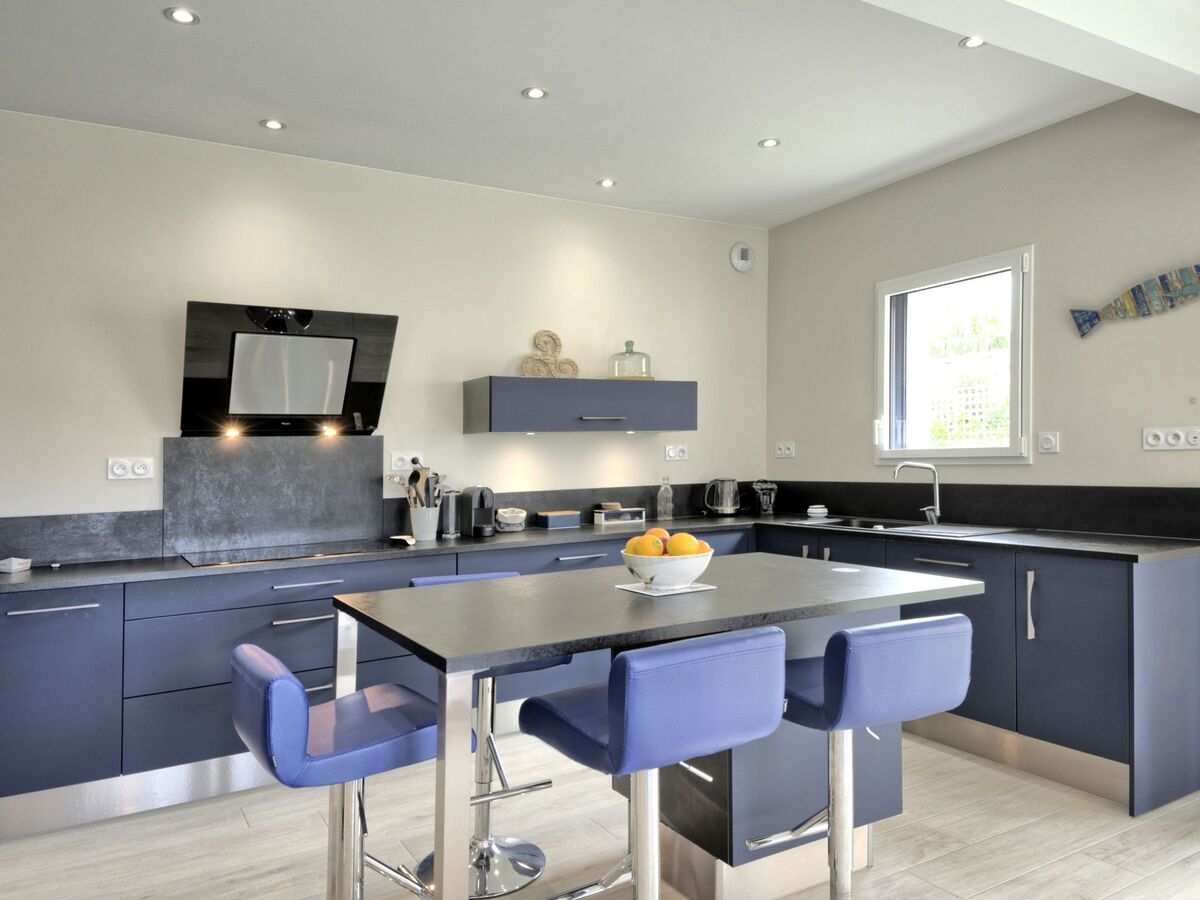 Grande cuisine ouverte (four, lave-vaisselle, 4 plaques à induction, grille-pain, bouilloire électrique, micro-ondes, congélateur, cafetière électrique, Capsules pour machine à café (NESPRESSO) (NON INCLUSES)) avec bar, table pour les repas.