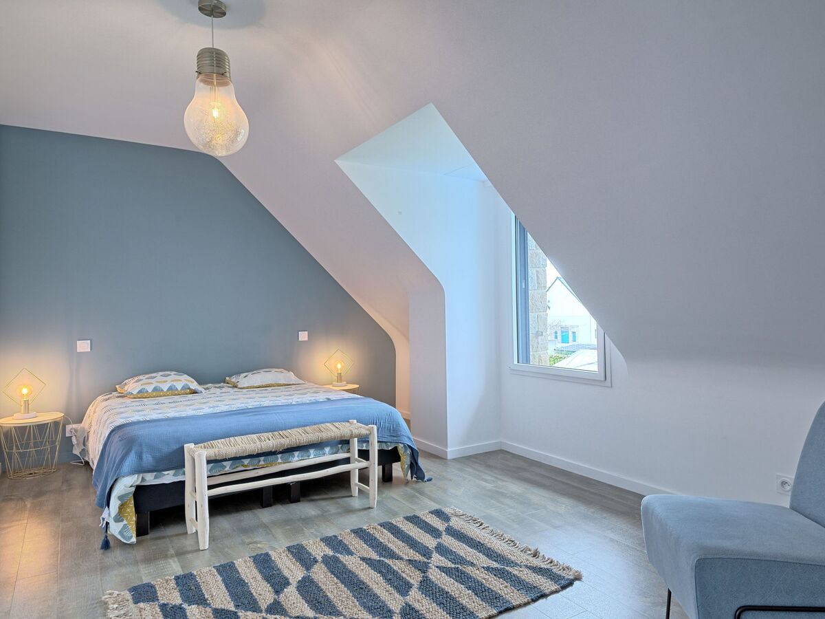 À l'étage supérieur: 1 chambre, mansardée avec 1 grand-lit (160 cm, longueur 200 cm).