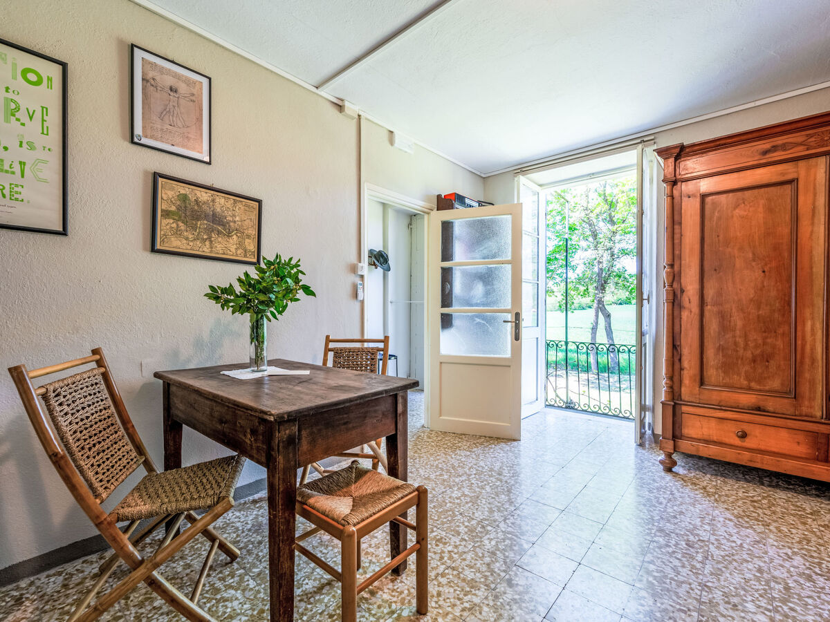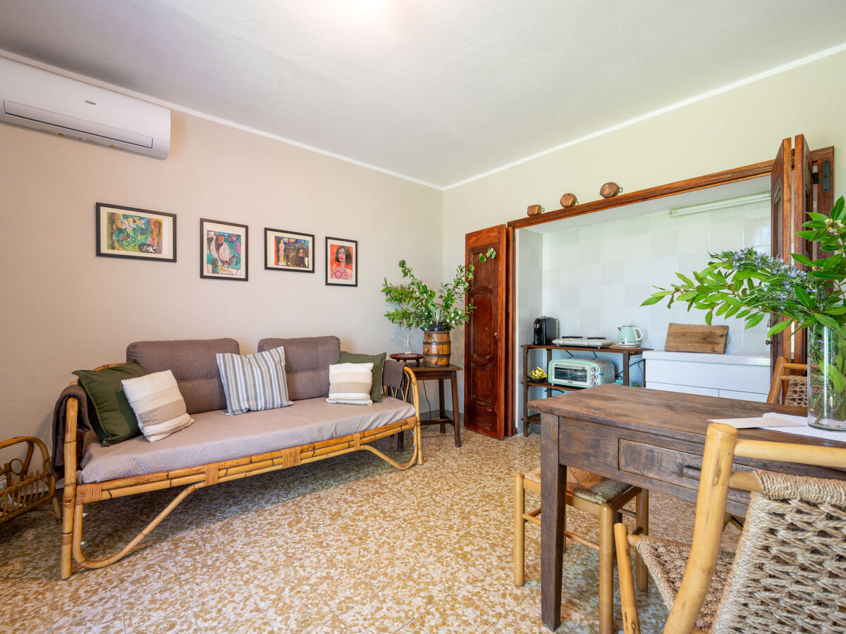 Aménagement simple et confortable: séjour/salle à manger avec 1 divan-lit et cheminée (uniquement à titre de décoration), table pour les repas et air-conditionné.